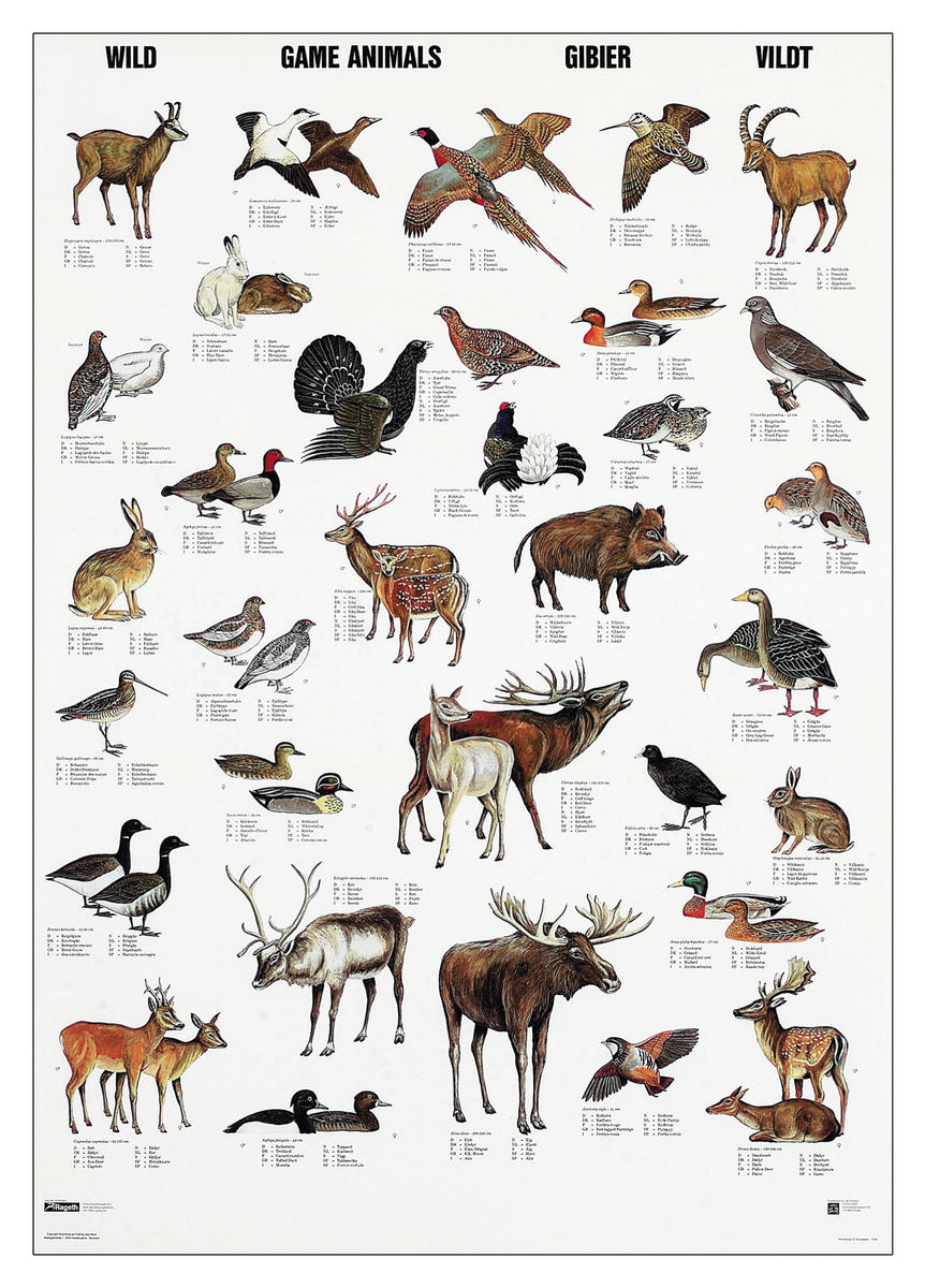 Visar 32 av de vanligaste vilda djuren i Europa. Många av djuren är även vanligt förekommande i vår svenska fauna. Djurens storlek finns angivna under varje bild. Affischen är flerspråkig med bl.a. de engelska djurnamnen.