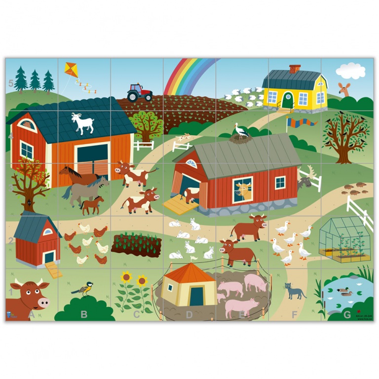 Mattan är rikt illustrerad med alla tänkbara djur man kan hitta på en bondgård. Hälsa på kaninerna, hönsen eller titta till fåren som är ute på bete. Räkna hur många djur ni kan hitta! Hur många träd finns det?
