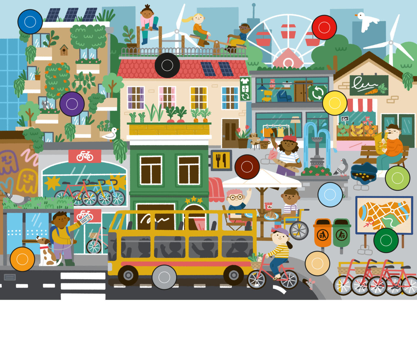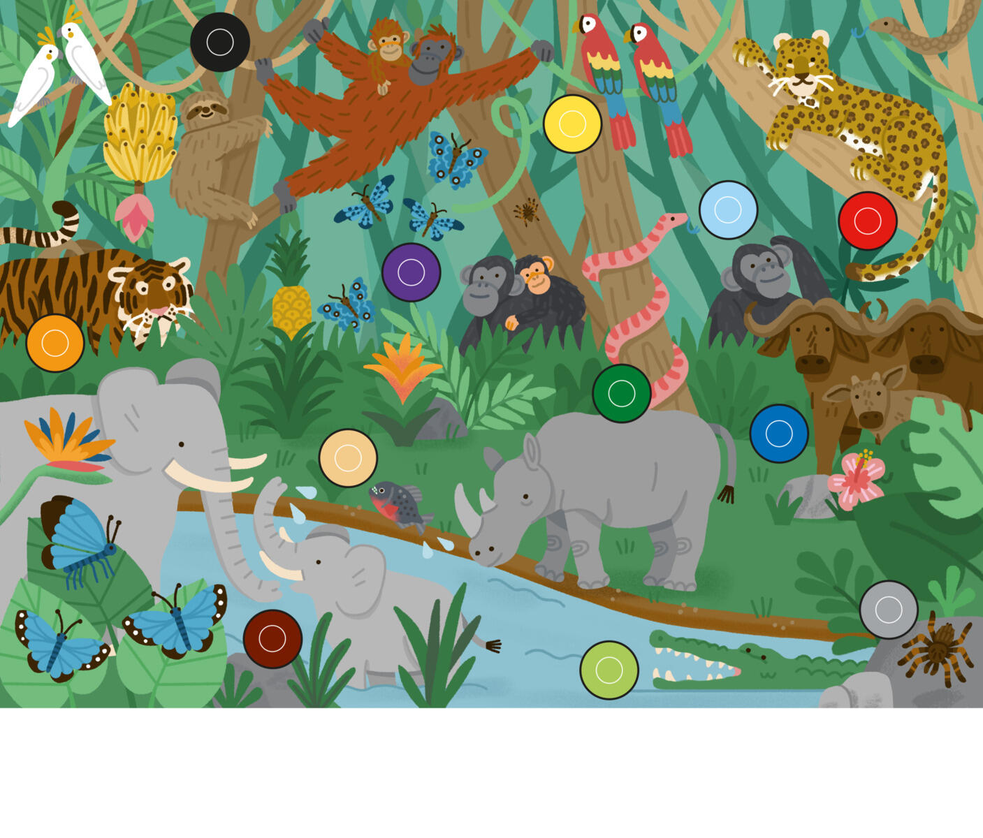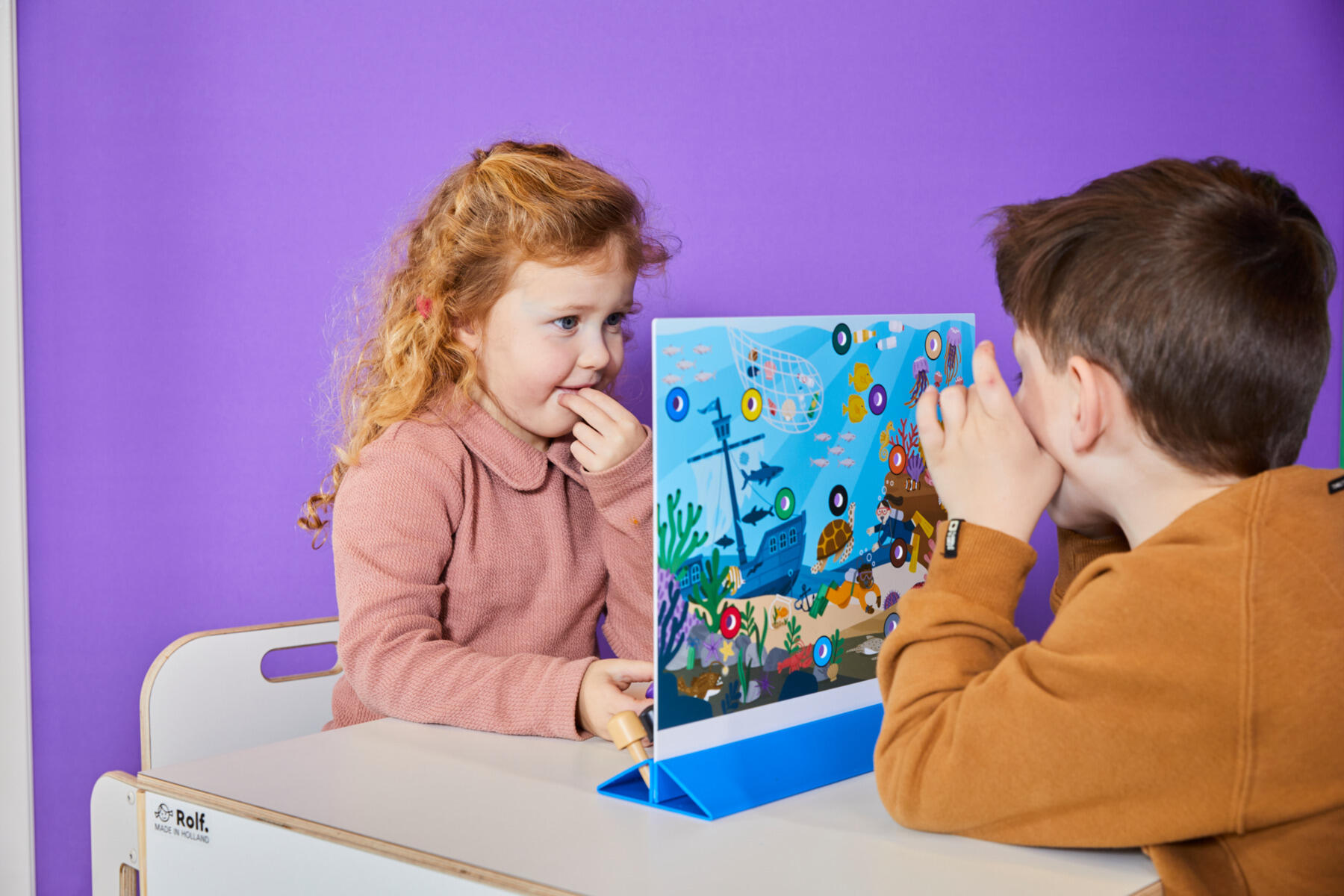 Samarbetsspel där barn tränar språk, lyssnande och kommunikation. Ett barn beskriver en plats på bilden medan det andra lyssnar och markerar med en färgad pin. Tillsammans försöker spelarna fylla hela bilden genom tydliga beskrivningar.