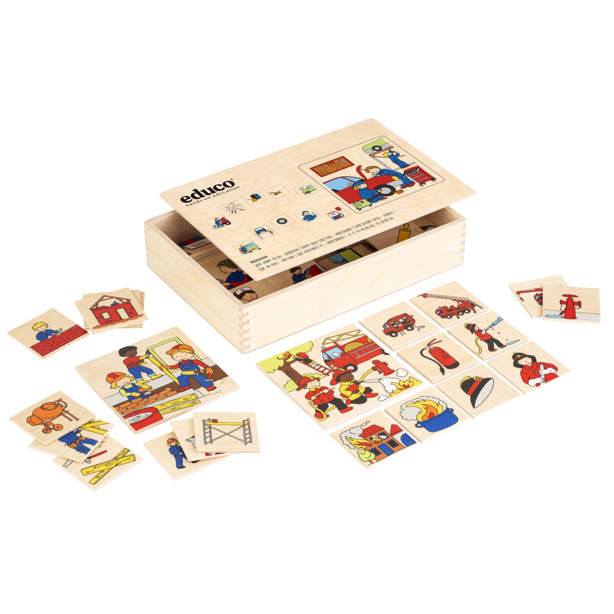 6 temabrickor i trä, 60 bildkort i trä, trälåda för förvaring. Material som tränar ordförråd och förståelse för begrepp. Dessa 6 detaljerade temabilder med olika yrken har vardera 10 relaterade bilder från ett yrke. Matcha föremålen som hör till de olika arbetsmiljöerna. Detta spel uppmuntrar barn att lära mer om yrken och olika arbetsuppgifter. Manual på engelska ingår. Mått: temabrickor 14×14 cm, bildkort 7×7 cm, trälåda 33,5×22,5×7 cm. Från 3 år.