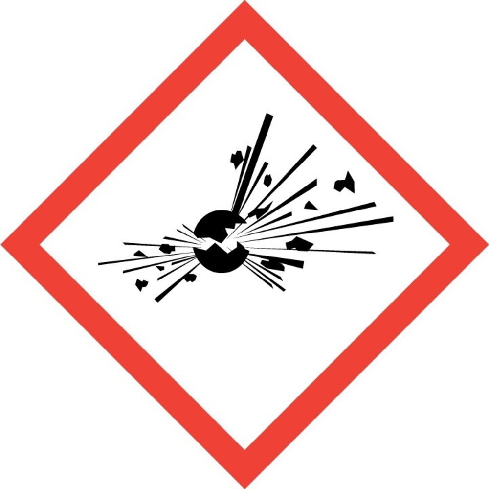 Varningsetikett GHS01 – Explosiv. 4 etiketter. Självhäftande. Svart/röd och vit. Mått: 100×1...