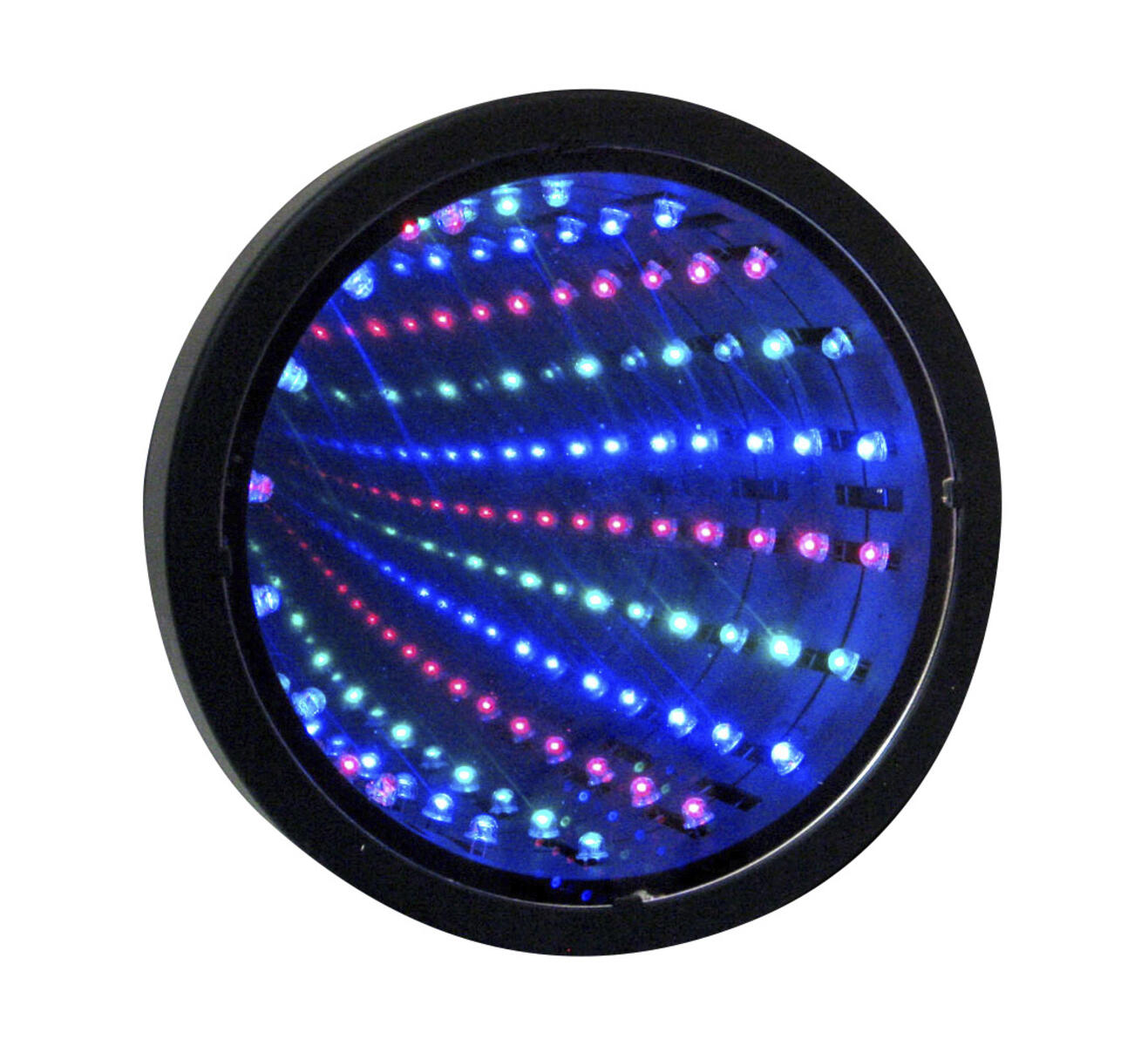 En rund spegel med färgade LED-lampor och reflekterande speglar som gör att man får intryck av att den fortsätter oändligt. Skapar en lugn och avslappnad miljö. Drivs av 3xAA-batterier (medföljer ej). Diameter: 15 cm