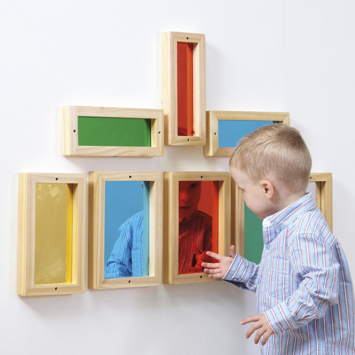 8 st/fp. En mångfärgad, sensorisk spegelsats, perfekt för öppet lärande. Barn kan titta i dem och utforska sina spegelbilder. Placera speglar i olika sammansättningar på väggen för ett färgkalejdoskop, eller placera dem i sensoriska rum för ljusinlärning. Ställ dem upp, stapla eller använda dem som brickor för samlingar och mönster. Mått: 10×24, 14×24 och 17×24 cm. Väggfästen ingår inte. Från 0 år.