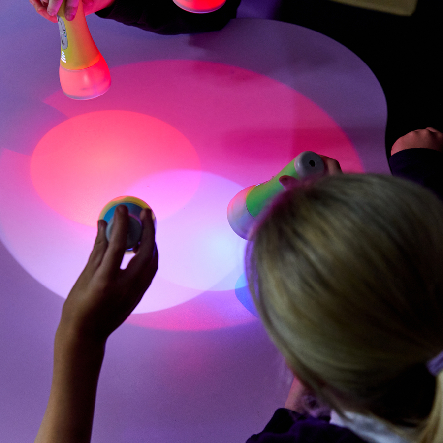 Ett set med 6 laddningsbara ficklampor i fyra ljusfärger: blå, röd, grön och vit. De ger en klar ljuskägla med bra skärpa och är perfekta för aktiviteter som utforskar ljus och färg. Lamporna laddas enkelt i den medföljande dockningsstationen och har en driftstid på ca 3,5 timmar per full laddning.