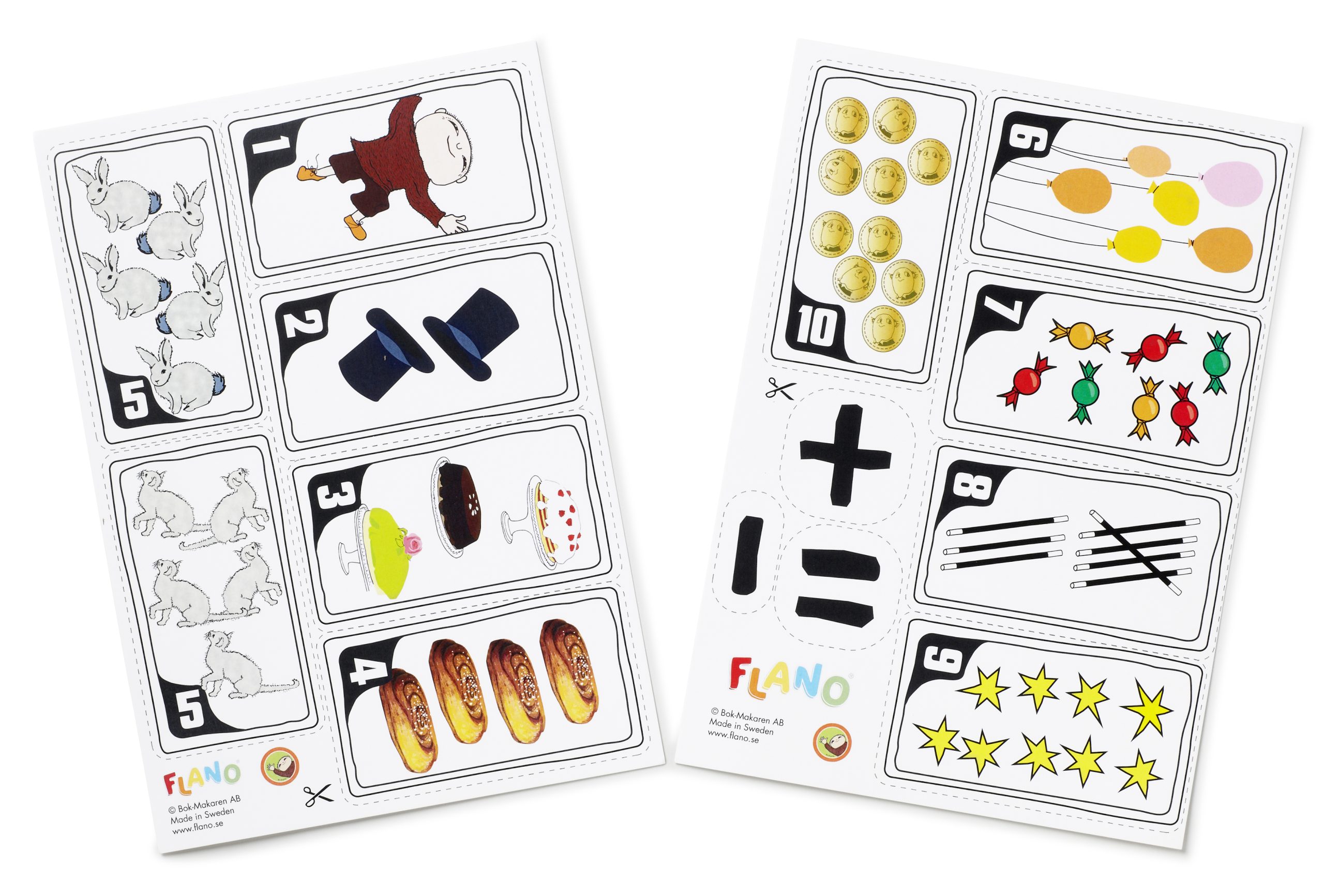 Vilka är 10-kompisar? Para ihop två tal som bildar det magiska talet 10. Hitta t.ex. vem som är 10-kompis med siffran två. Ett pedagogiskt och lekfullt verktyg för att lära sig räkna. Innehåller 2 flanoark i A4-format. Klipp ut sifferbilderna som fäster lätt på en flanotavla. Av FSC-märkt papper.