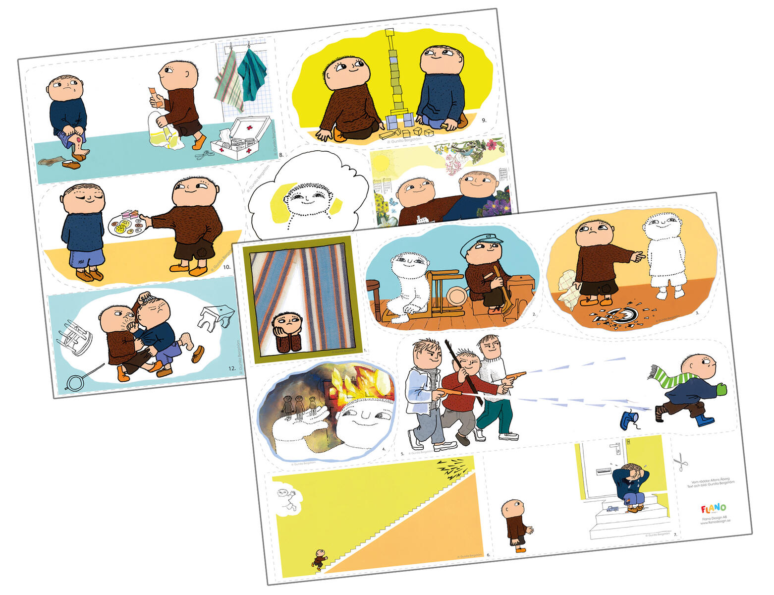 Ett set med två kompissagor. Sagotext ingår. Tryckt på tålig yta med flanellografkartong på baksidan. Av FSC-märkt papper.
