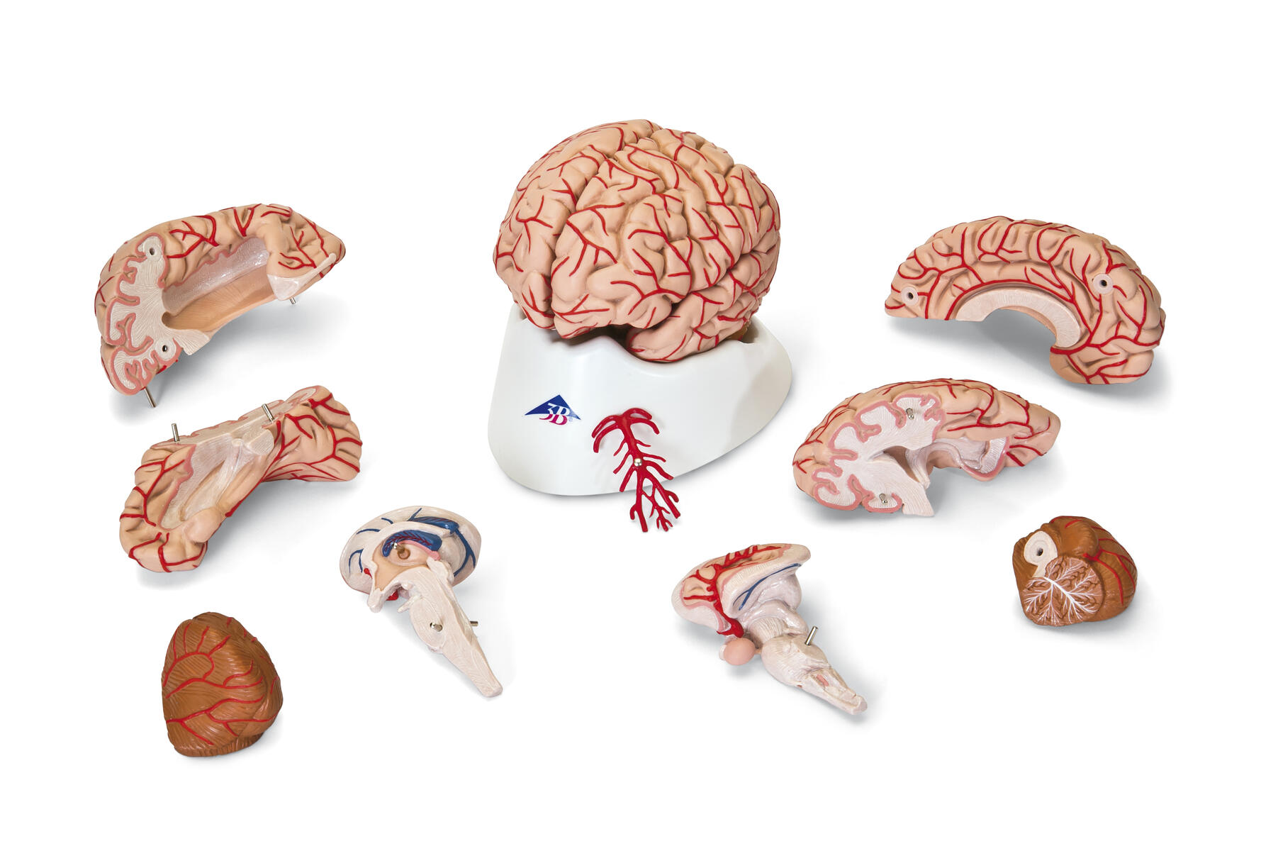 Detaljerad och delbar hjärna i naturlig storlek med tydligt markerade artärer. Varje hjärnhalva kan delas upp i 4 delar och basartären är löstagbar.