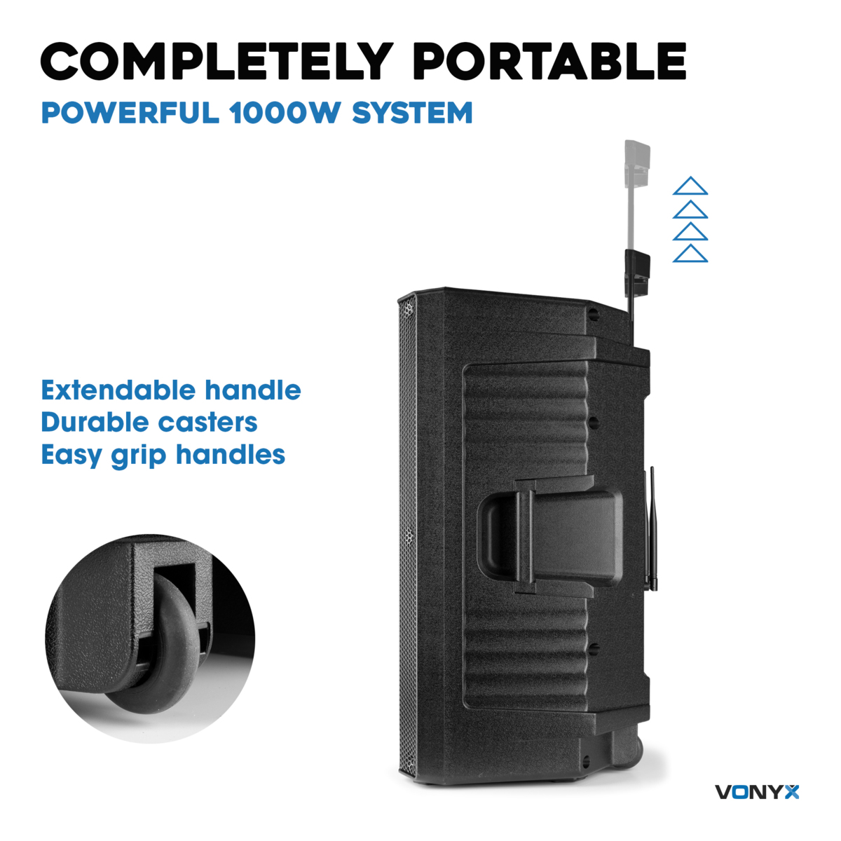 Trådlös, portabel högtalare för smartphone eller platta. Koppla in de två tillhörande mikrofonerna, en mixer eller annan ljudkälla via Bluetooth. Inbyggd multimediaspelare (USB), digital LCD-display, inbyggd equalizer, gitarr-, stereo line- och mikrofoningångar samt mix output (XLR). Fjärrkontroll och kabel (4 m NL2).