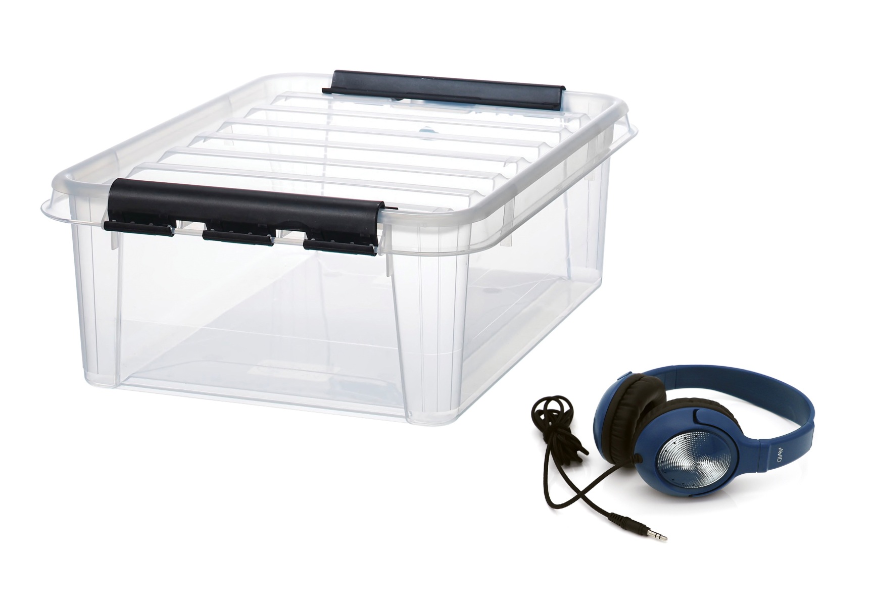 15 st AE-54 hörlurar i förvaringslåda. Praktiska och tåliga hörlurar med ljudreducerande öronkåpor med minimalt ljudläckage. Tuggresistent kabel med förstärkta kabelinfästningar. På varje sladd sitter ett litet kardborreband för att sladdarna lätt ska kunna rullas ihop och förvaras enkelt utan trassel.