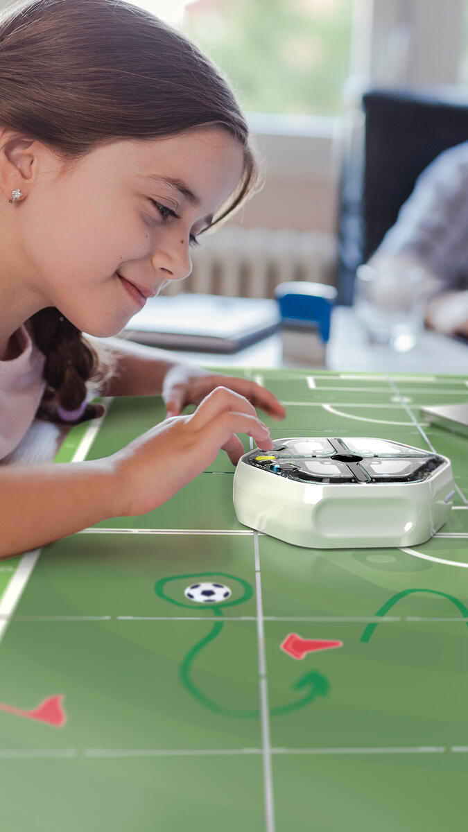 Använd Root till att spela fotboll. Spelplan med rutnät för enklare programmeringsövningar. Från 6 år.