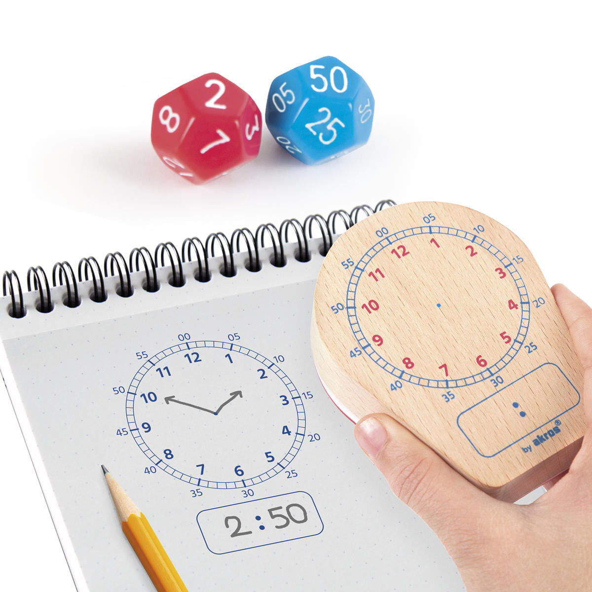 Stämpla, kasta tärningarna och säg vad klockan är. På detta vis lär sig barnen klockan både analogt och digitalt samtidigt som de har roligt. Inkluderar en stor stämpel som kan användas med valfritt bläck och två tärningar.
