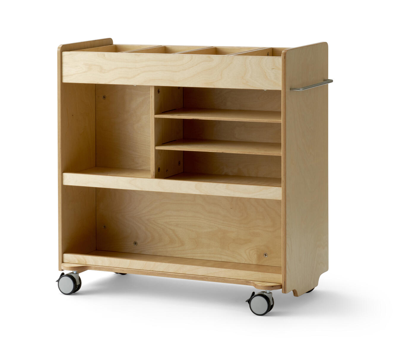 Mindre materialvagn på hjul med mängder av fack och möjligheter. 4 låsbara hjul och handtag på ena kortsidan. Ena sidan har två grunda fack på varandra längs hela bredden, innermått B77xH22xD8 cm. Andra sidan har 1 större fack underst, innermått B77xH30xD19 cm och tudelade fack över med hyllplats för plattare material. På ovansidan finns ett mindre, fast fack och 3 lösa lådor, yttermått B18xH7xD28 cm. Hela vagnens yttermått: B80xH80xD40 cm. Totalvikt 25 kg. Levereras omonterat. Monteringsanvisning medföljer. FSC-certifierad plywood lackad med vattenbaserat lack. Rengör vagnen med fuktig trasa och milt diskmedel vid behov. CE-märkt.