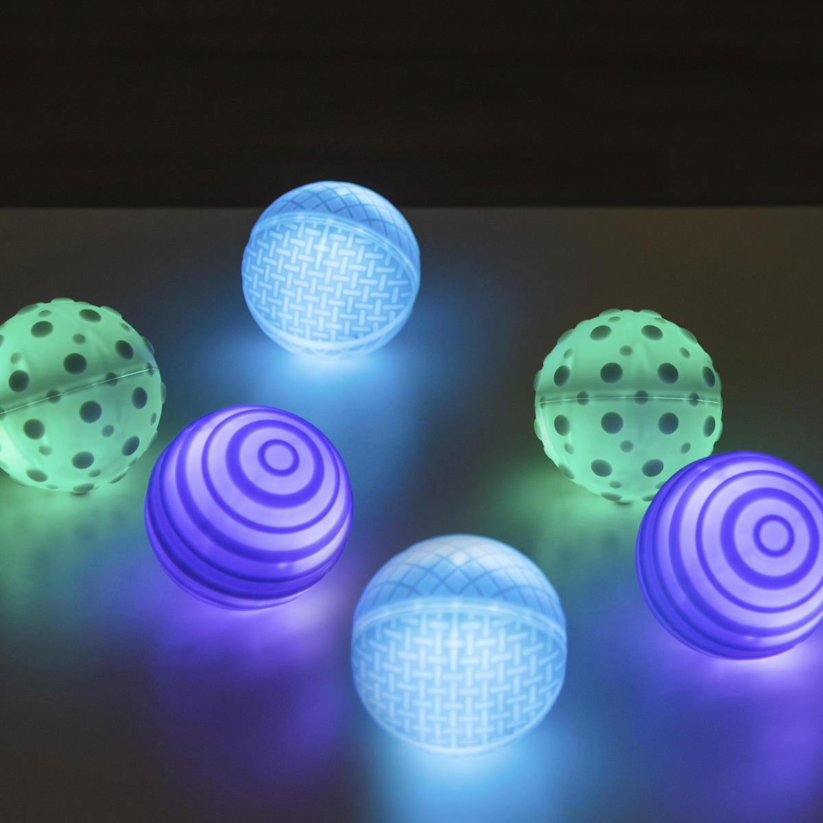 Fascinerande bollar med olika taktila ytor. Lyser upp i 60 sekunder när de skakas. De är rogivande och tränar finmotoriken och öga-handkoordinationen. Rulla dem i lera för att skapa spännande mönster. För de minsta barnen tränas orsak och verkan och stimulusrespons.