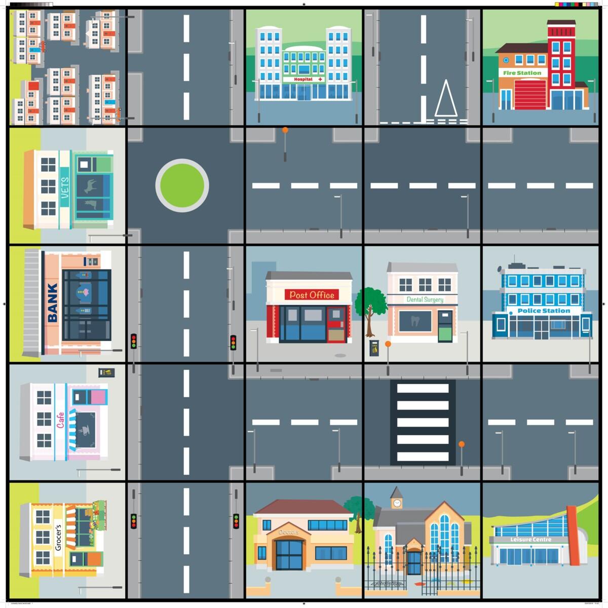 1 st/fp. Pedagogisk matta för Bee‑Bot och Blue‑Bot, där man kan programmera roboten genom olika platser i samhället som sjukhus, brandstation och polisstation. Stödjer lärande om viktiga yrken samtidigt som barnen tränar programmering. Kompatibel med andra Bee‑Bot World‑mattor. Tillverkad i mjuk, slitstark och ftalatfri plast.