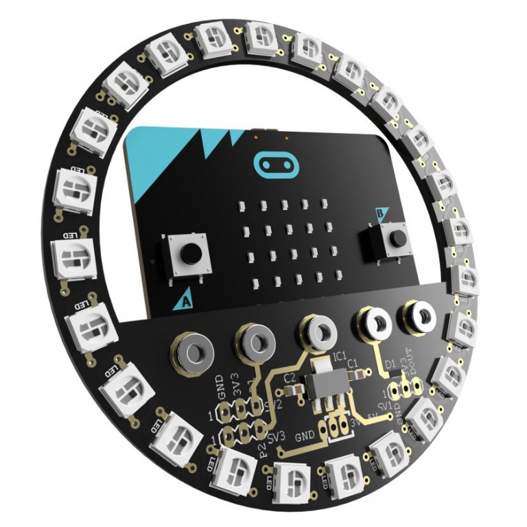 Halo skruvas direkt på micro:bit. Kortet har också förlängningsplintar (0,1" höga) vilket gör det möjligt att ansluta fler RGB-lysdioder. P1- och P2-anslutningarna ansluts också till 0,1" anslutningar tillsammans med spänningsmatning och GND. Det möjliggör ytterligare anslutningar till komponenter med låg effekt som sensorer och strömbrytare.