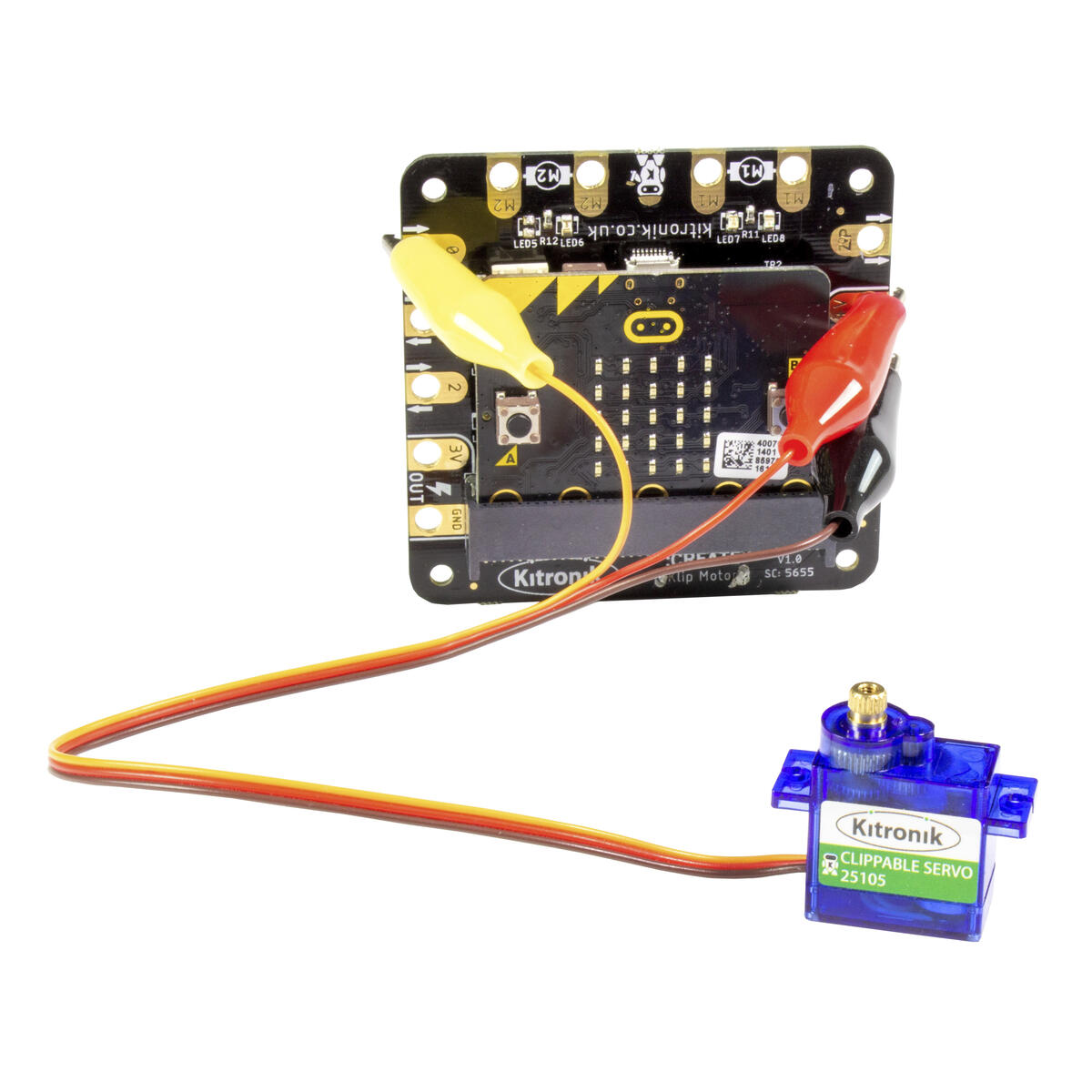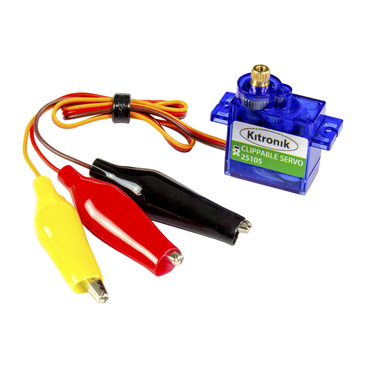 180-graders servo med krokodilklämmor. Programmeras med MakeCode eller Python.