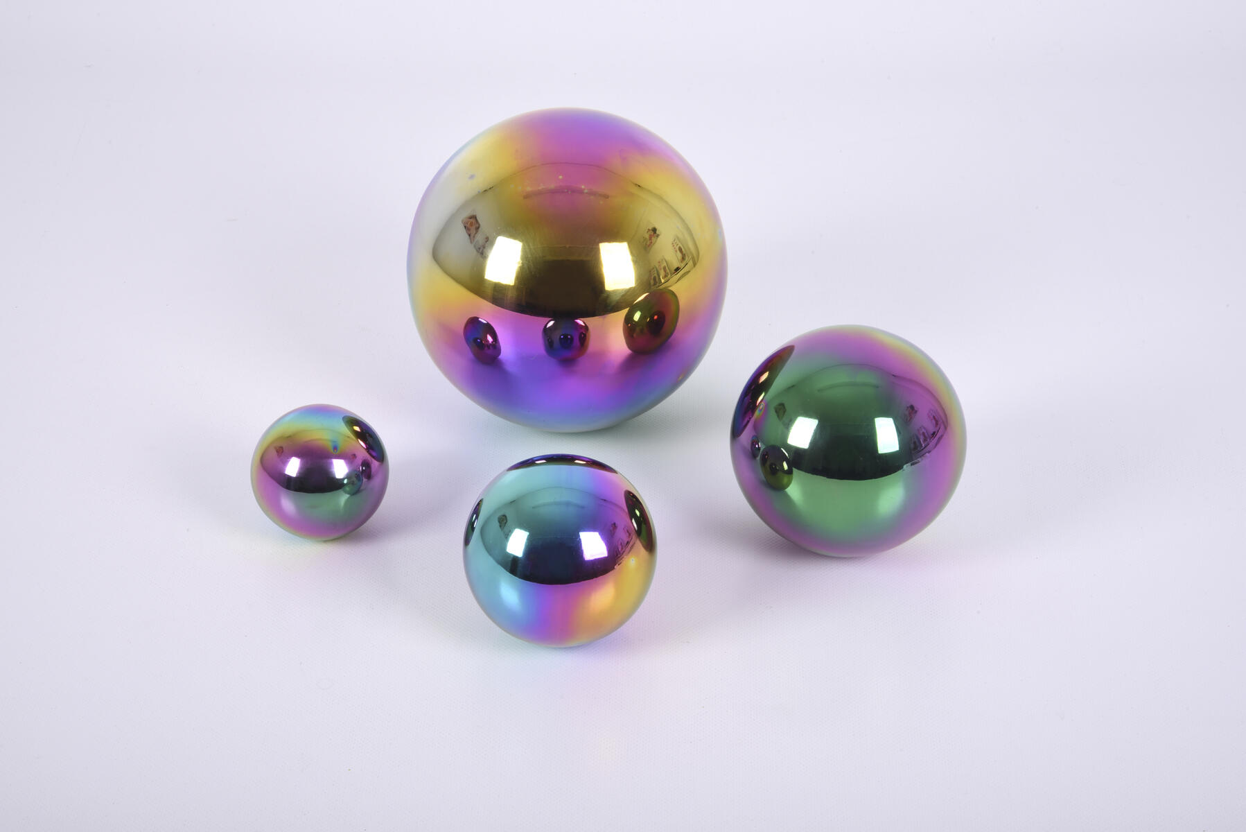 Fyra vackra multifärgade kulor i olika storlekar (6, 8, 10, 15 cm) av rostfritt stål. ...