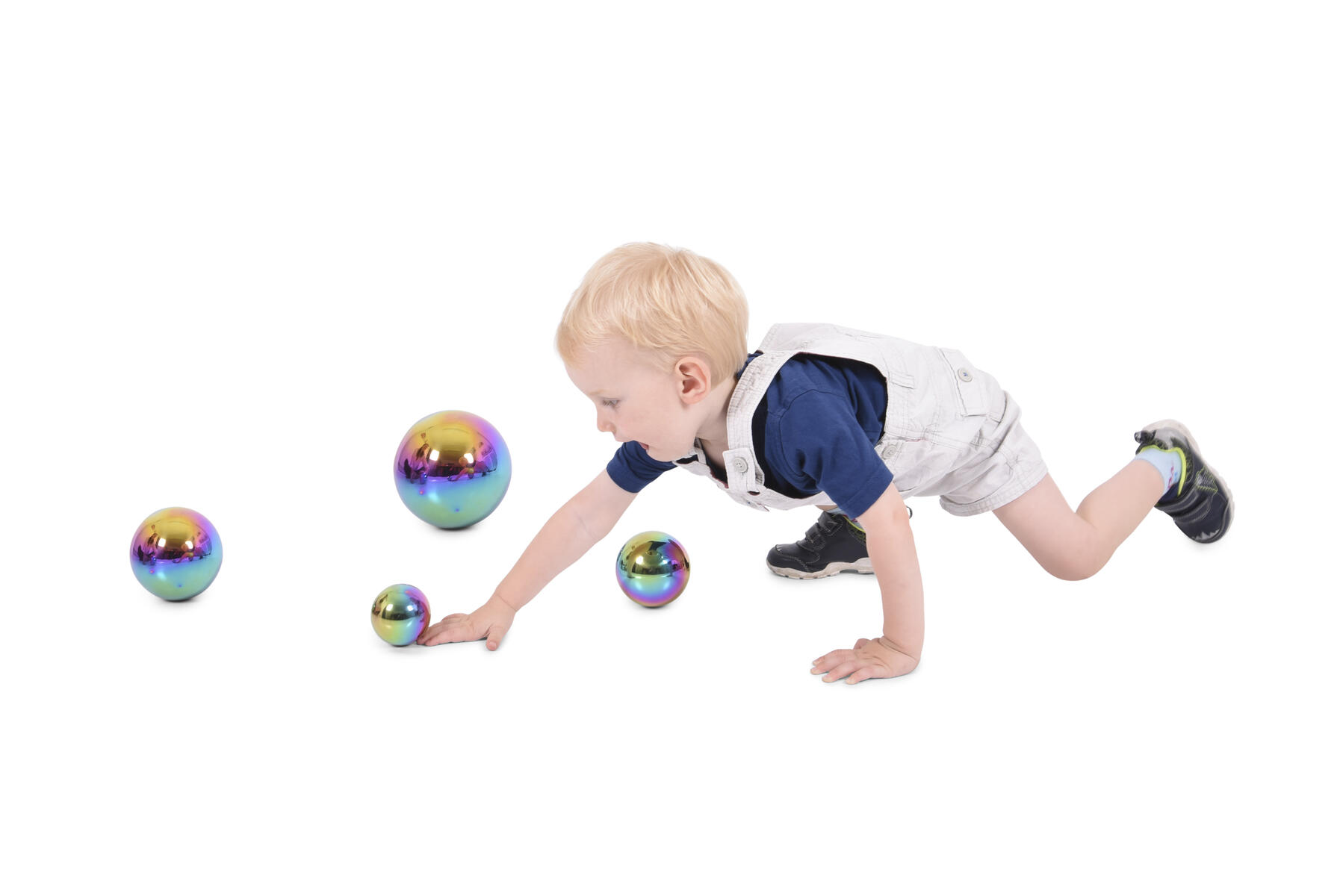 Fyra vackra multifärgade kulor i olika storlekar (6, 8, 10, 15 cm) av rostfritt stål. Färgerna framträder på många olika sätt på varje kula med hjälp av den fascinerande reflektionen. Från 0 år.