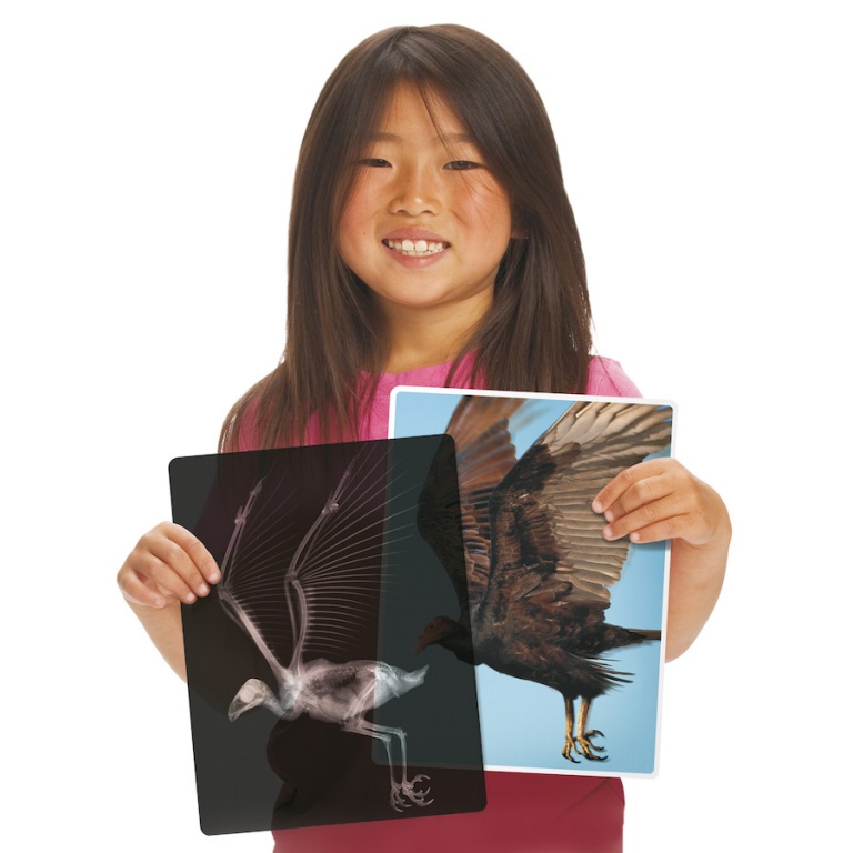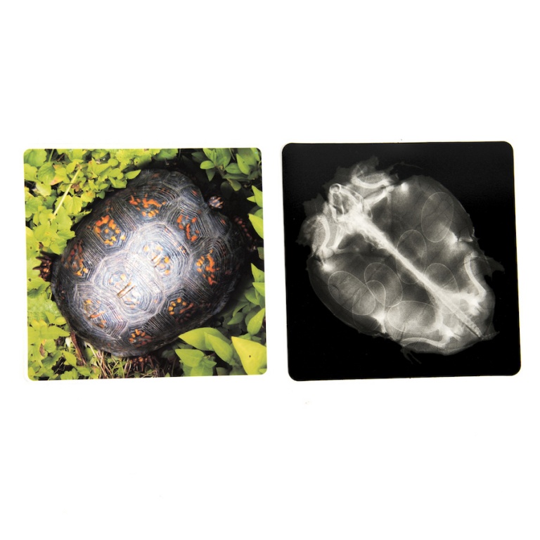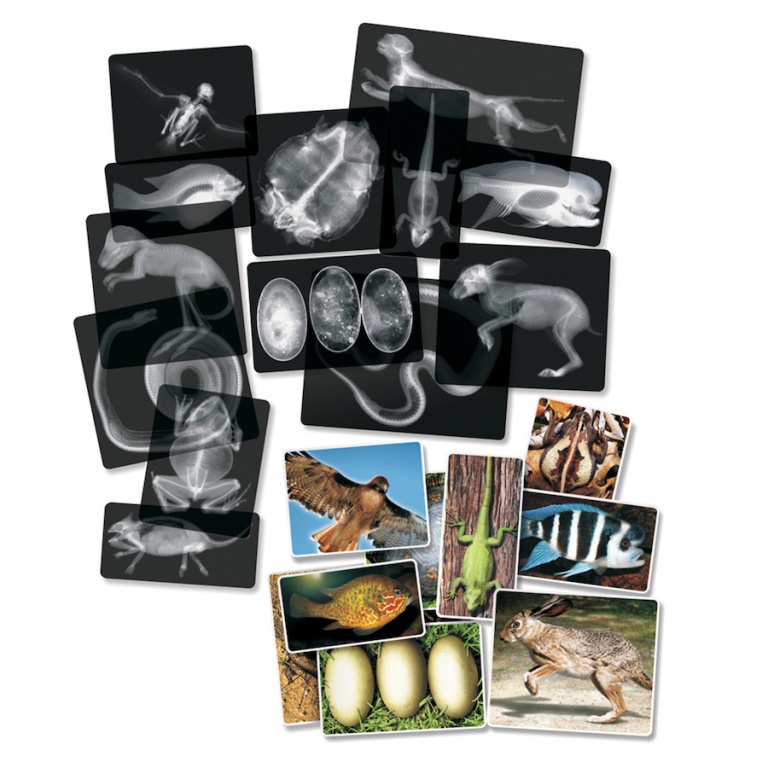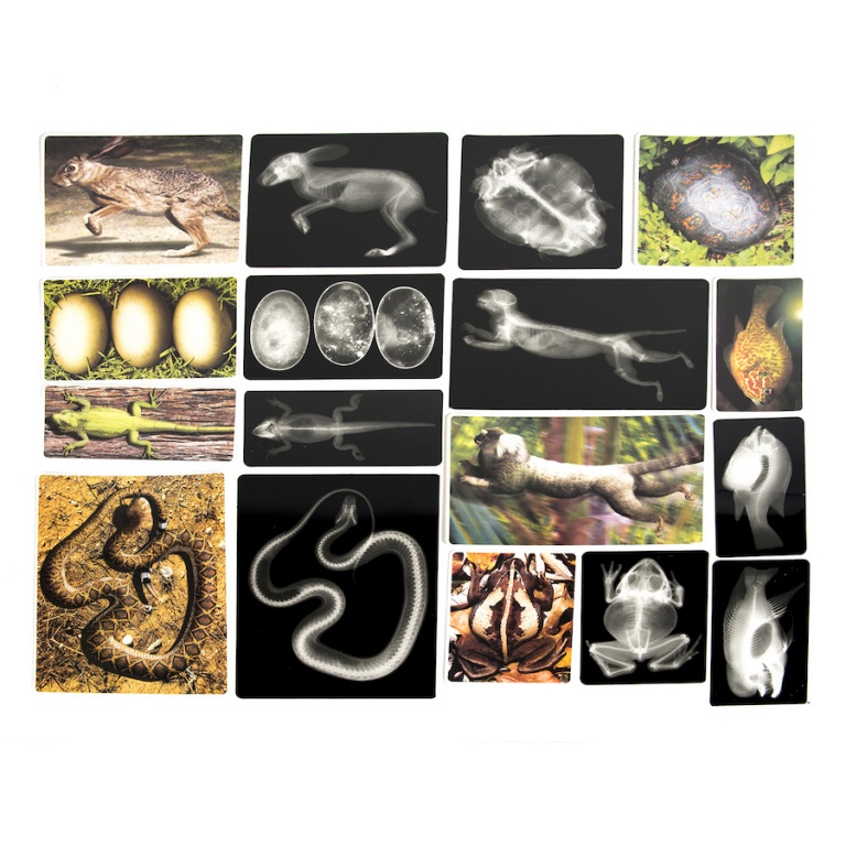 Fjorton röntgenbilder på olika djur samt en färgbild på hur djuret ser ut i verkligheten.