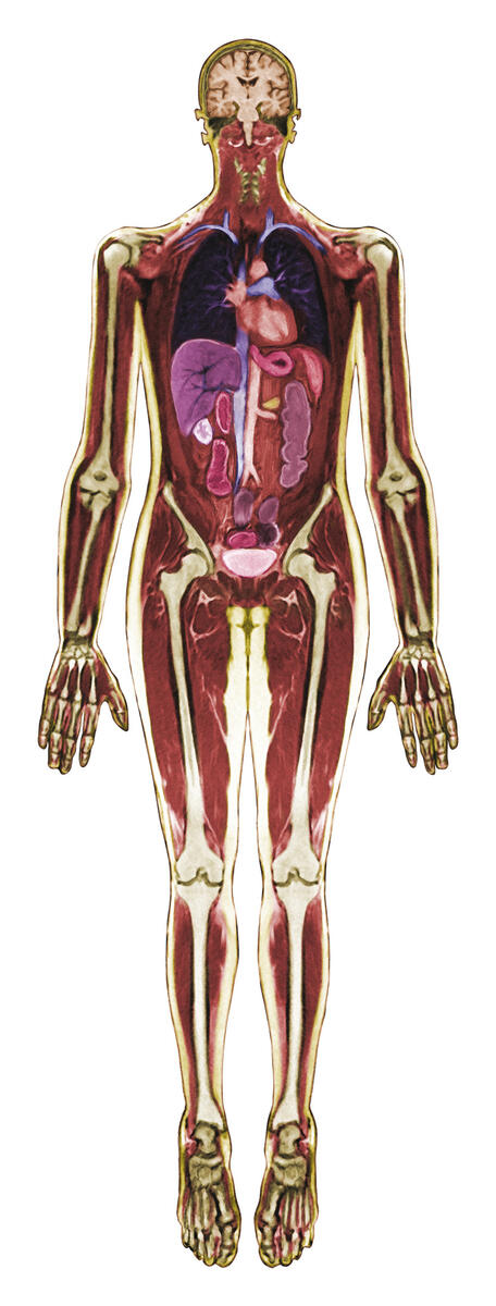 En 1,5 m lång, komplett röntgenbild av kroppen, samt två bilder som visar mer detaljer på organen.