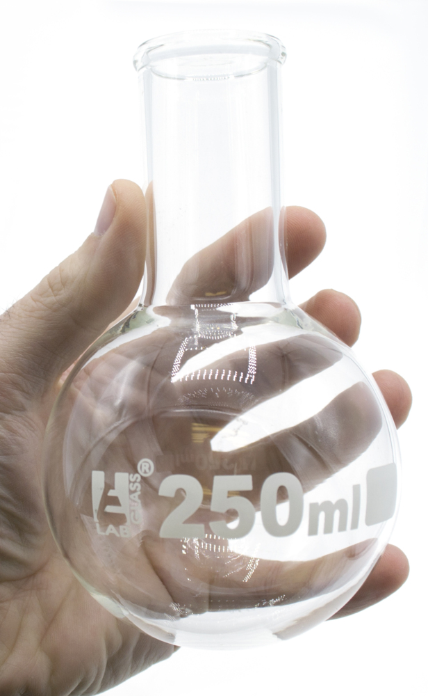 Rundkolv borosilikatglas 250 ml. Den har följande värmetoleranser: Sträckpunkt -515°C | Glödgningpunkt 565°C | Mjukningspunkt 820°C.