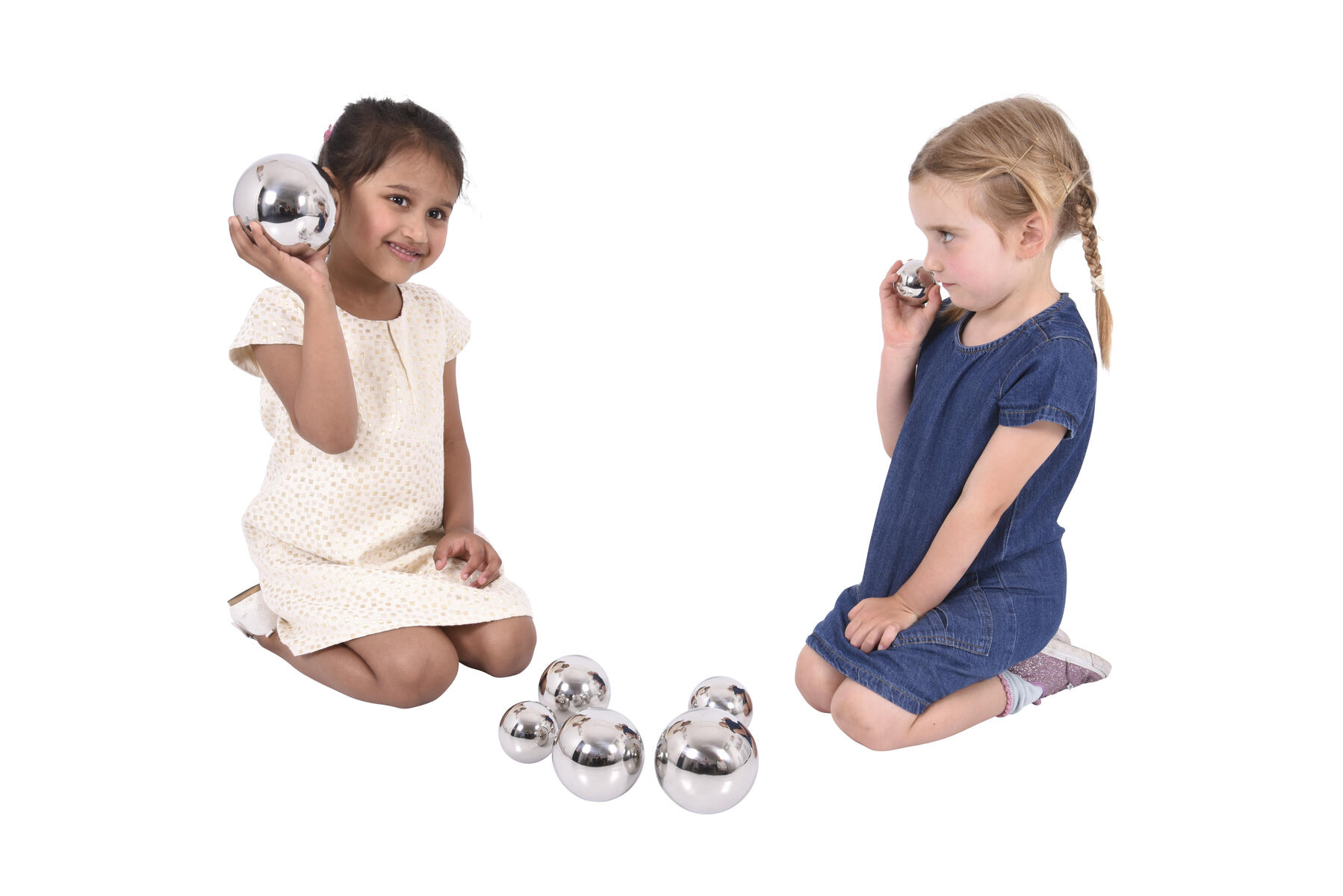 7 klot i rostfritt stål i olika storlekar (5, 6, 7, 8, 9, 10 och 11 cm) med olika ljud. De har också olika rörelsemönster. De är lätta, lena och taktila. De minsta fascineras av reflektionen av sig själva och ljudet, medan de äldre funderar över hur de kan låta och röra sig annorlunda. Från 0 år.