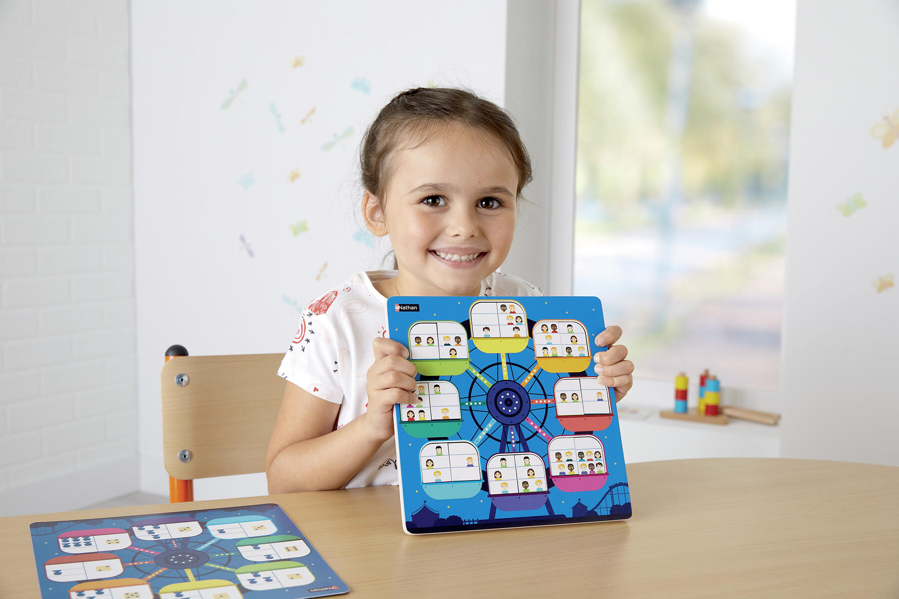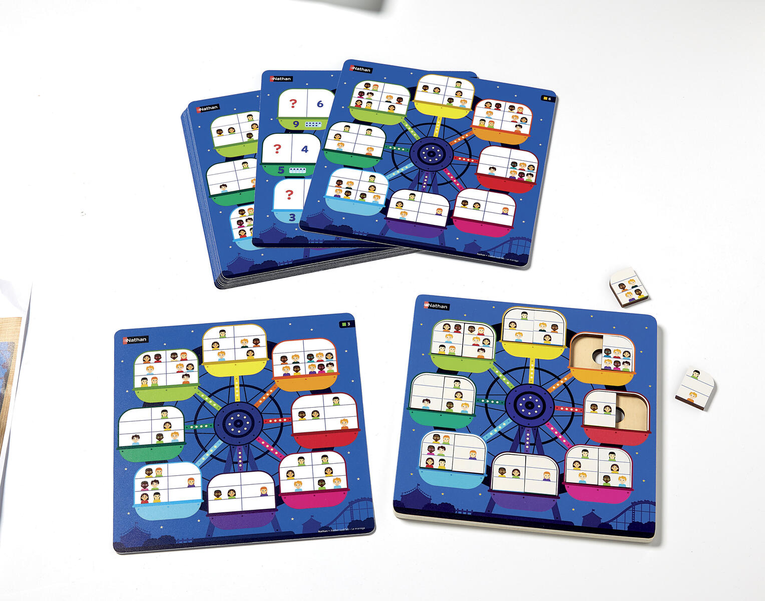 Ett pussel för att träna på numeriska problem upp till 10. För att kunna åka karusellen behöver man hoppa in i rätt hytt. Olika siffror kombineras sedan för att få rätt antal i varje hytt. Flera lösningar är möjliga, t.ex. kan 5 barn i en hytt vara 4+1 eller 3+2. Innehåller 2 identiska 16-bitarspussel, 12 dubbelsidiga aktivitetskort med 24 olika aktiviteter samt instruktioner.