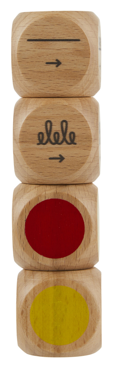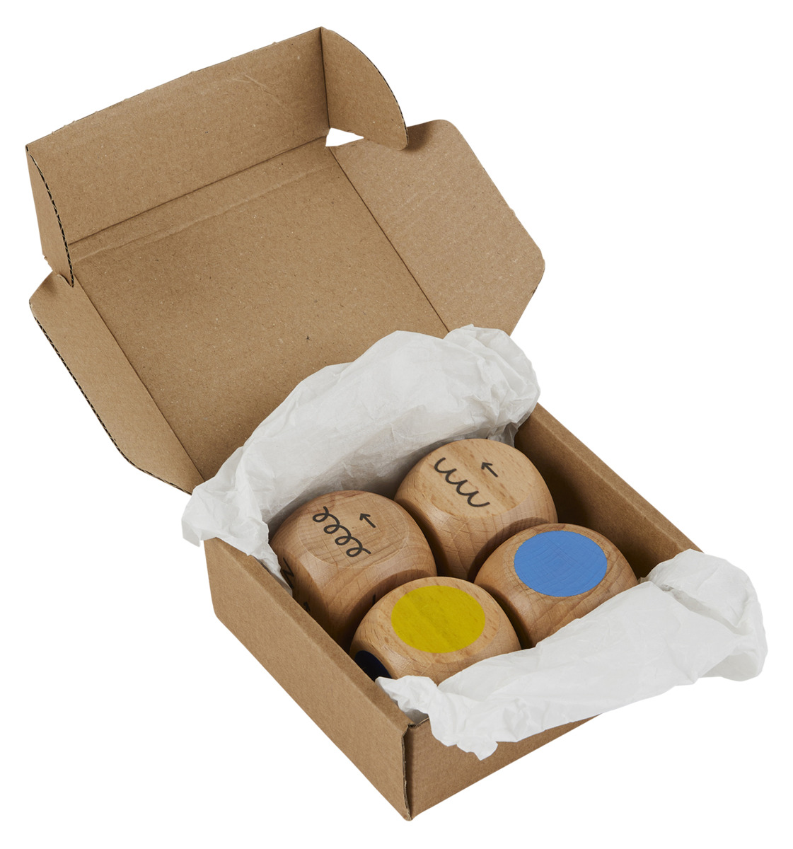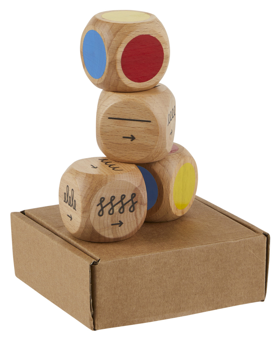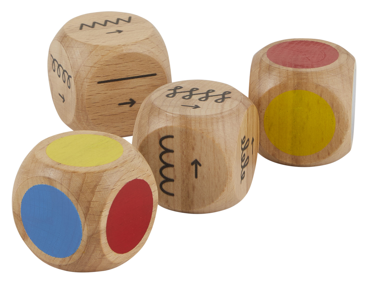 4 st. Tärningar för skrivträning. Två tärningar har olika färger och två har olika skrivmönster.
