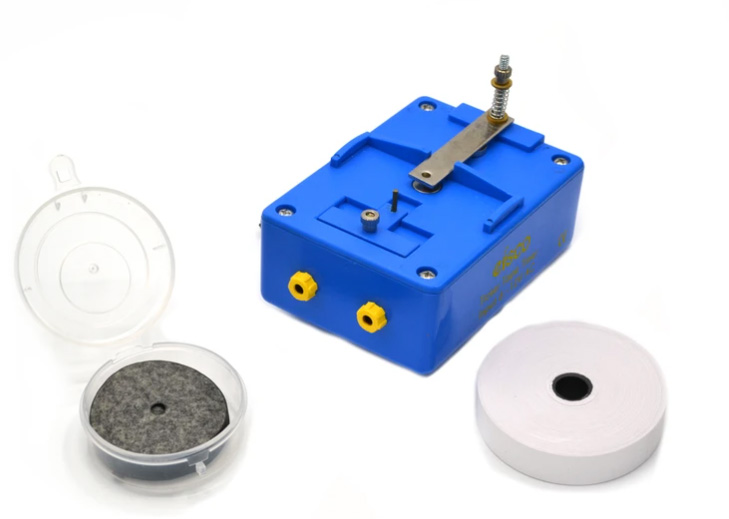 Levereras med en rulle pappersremsa (50 m) samt 100 st kolfiberskivor. Mått: 11x8x4 cm. I ABS och metall.