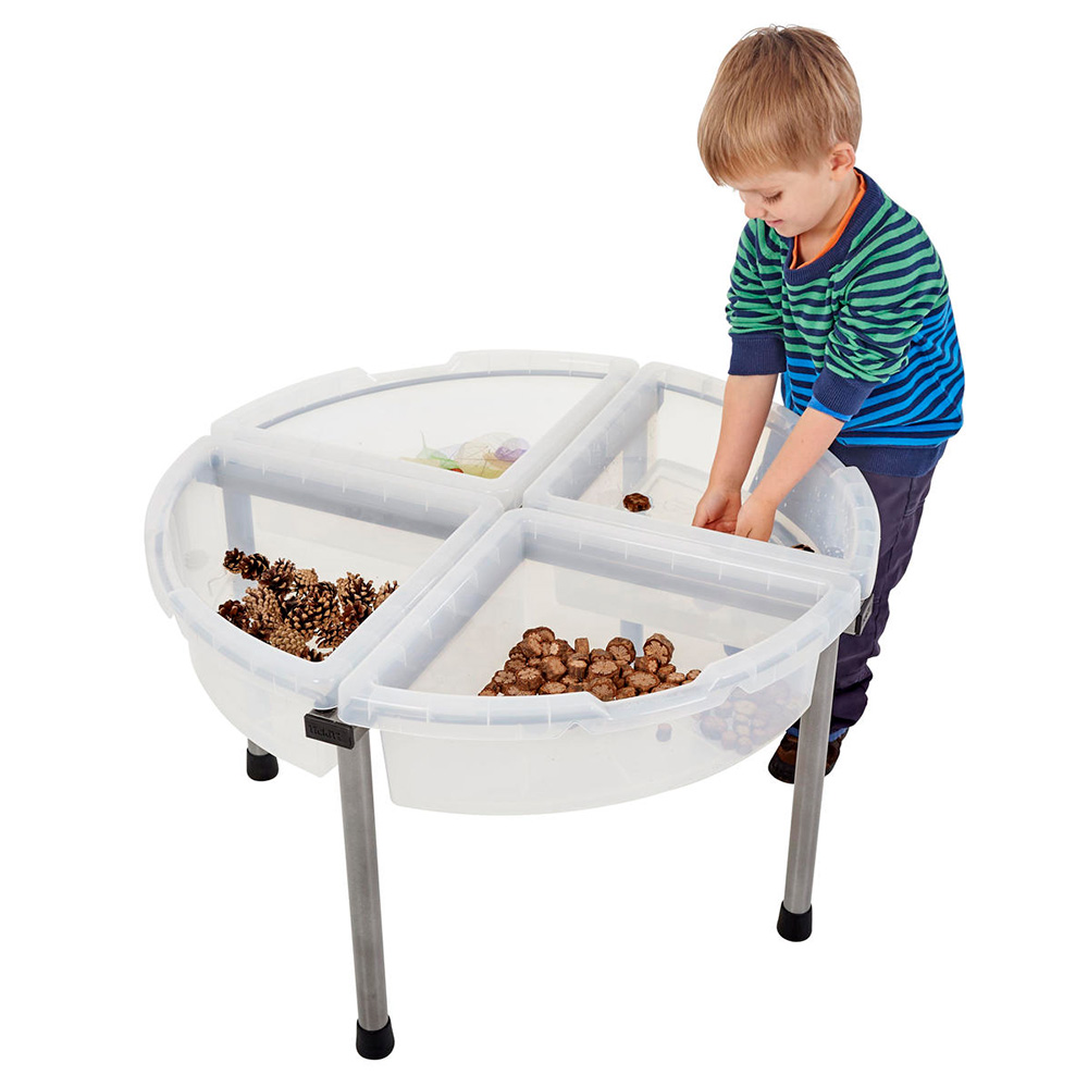 Här kan barnen leka och upptäcka egenskaper hos olika material som t.ex. löv, sand eller vatten. De 4 transparenta, triangulära baljorna kan man enkelt lyfta, tömma och ta med sig för insamling av material. Den runda formen gör att många barn får plats runt vilket ger en bra grund för samarbete.