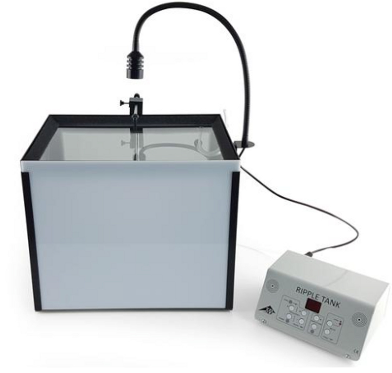 Vågtank med tillbehör som används för att demonstrera och undersöka vågors egenskaper med hjälp av vattenvågor. Passar bra för fysikundervisning där vågbegrepp som utbredning, interferens och reflektion ska visas praktiskt.