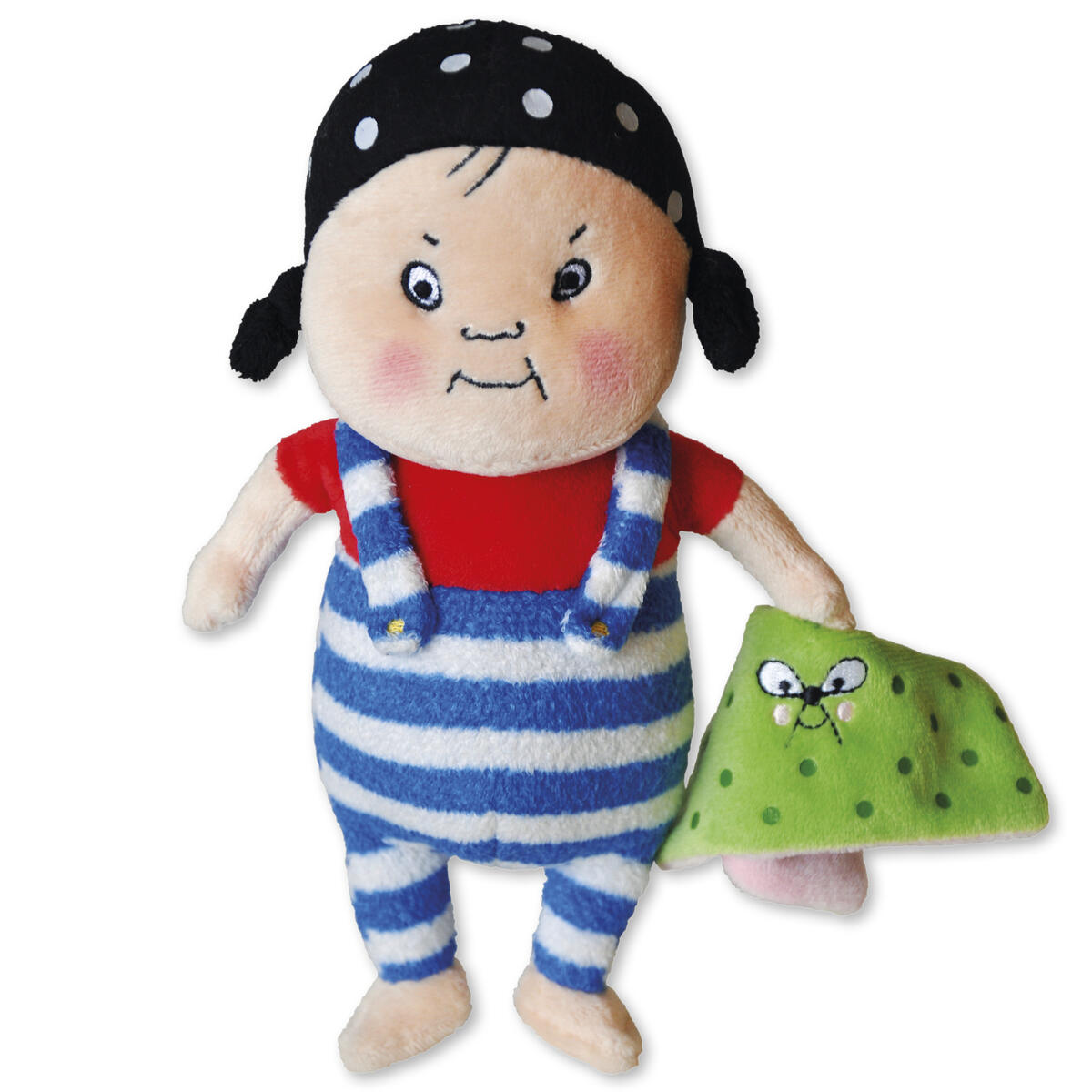 Dockan är tillverkad i mjuk plysch med glada färger och fina detaljer. 22 cm lång, handtvätt 30 grader