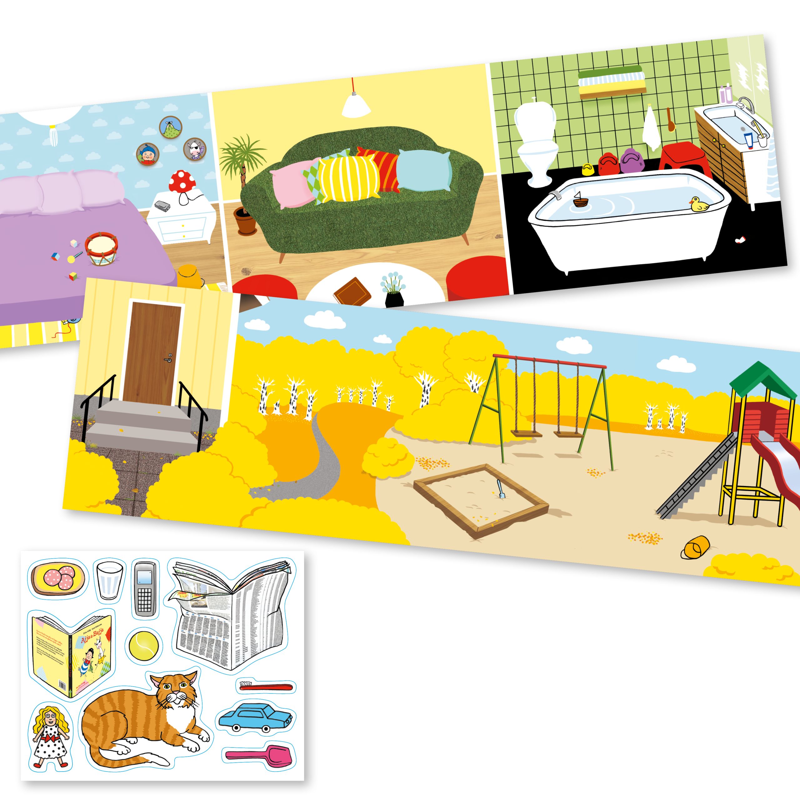 Teaterkuliss i kartong, tre ihopsatta ark à 300×250 mm. Följande pappfigurer ingår: docka, glas, katt, boll, tandborste, tidning, bok, smörgås, leksaksbil, spade, mobiltelefon.
