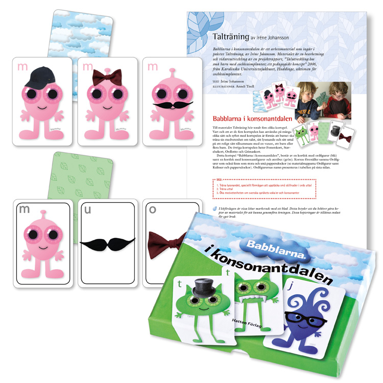 ”t” med en hatt på huvudet blir ”Tatta” och ”m” med en mustasch blir ”Mummu”. Babblarna i Konsonantdalen är ett roligt kortspel med helt nya Babblarfigurer.