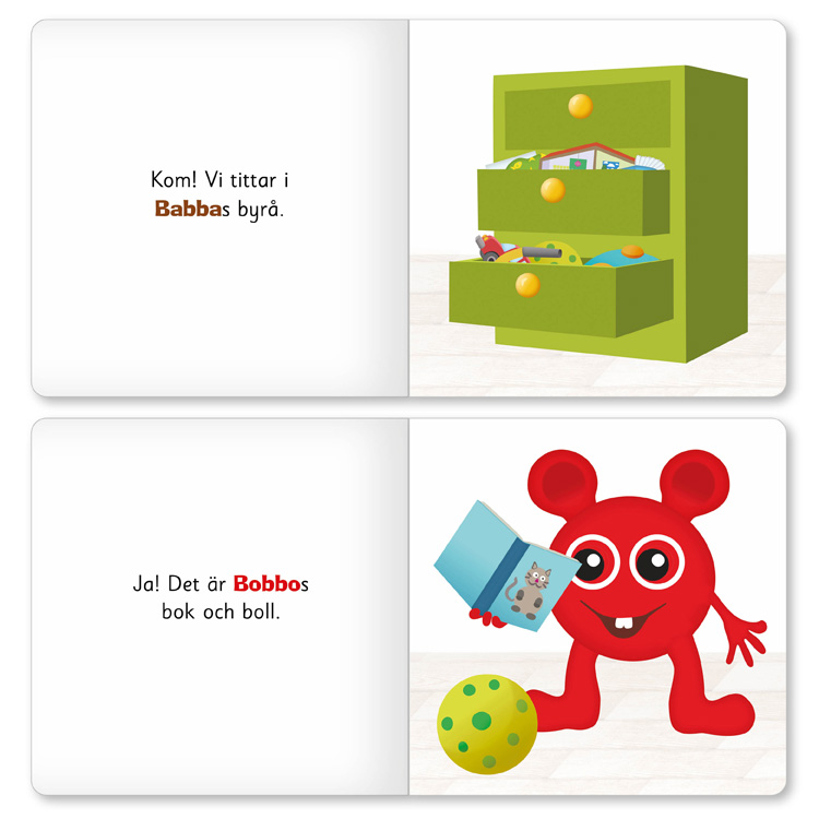 Kartongbok i stort format. I Babbas byrå finns massor av saker. Men vems är alla saker? Hjälp Babba att dela ut sakerna till sina vänner. Boken I Babbas byrå fokuserar särskilt på begreppet ”Vems?” men också på de små men viktiga vokal- och konsonantskillnaderna i Babblarnas namn. Längst bak finns teckenillustrationer för orden i boken.