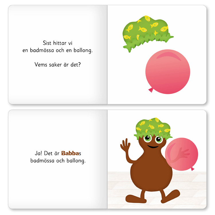 Denna bok fokuserar särskilt på begreppet Vems? I Babbas byrå finns massor av saker. Men vems är alla saker? Hjälp Babba att dela ut sakerna till sina vänner.