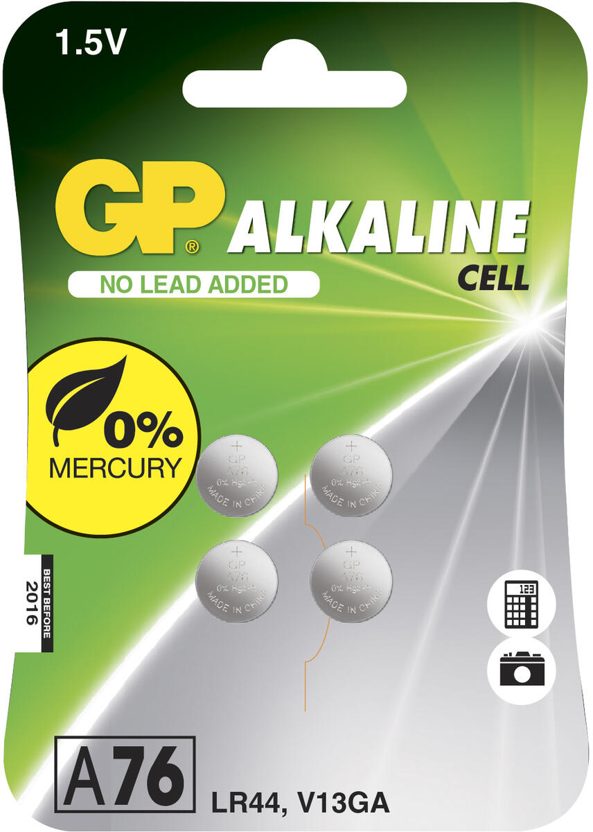 GP knappcell 1,5 V, A76/LR44. Alkaliskt standardbatteri för de flesta produkter med låg till medelhög strömförbrukning som leksaker, väggklockor och ficklampor. Lång livslängd.