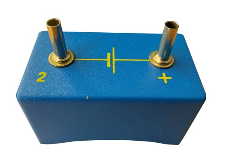Batteriet sitter mycket stabilt i hållaren och kopplas med 4mm banankontakt till extern labbutrustning. Den är mycket praktisk och lätt att använda för t.ex. experiment i ellära i skolan.