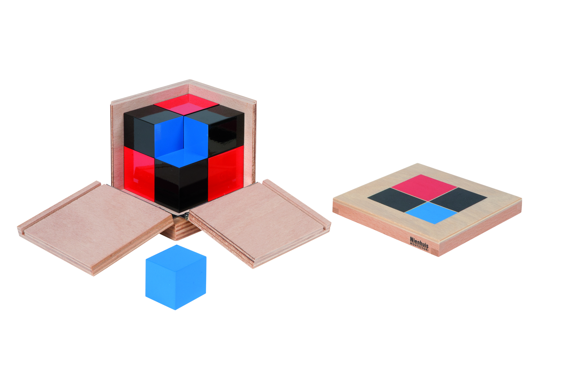 Binomiala kuben även kallad binomen. 8 träprismor/träkuber lackerade i rött, svart och blått. Övar förmågan att se skillnad i 3 olika dimensioner, tränar uppfattning av matematiska mönster och förbereder för arbete med algebra. Kan användas med yngre barn som ett pussel men ger också en konkret upplevelse av ekvationen (a+b)³. Kuben förvaras i en trälåda med lock där 2 sidor är nedfällbara. Från 4 år.