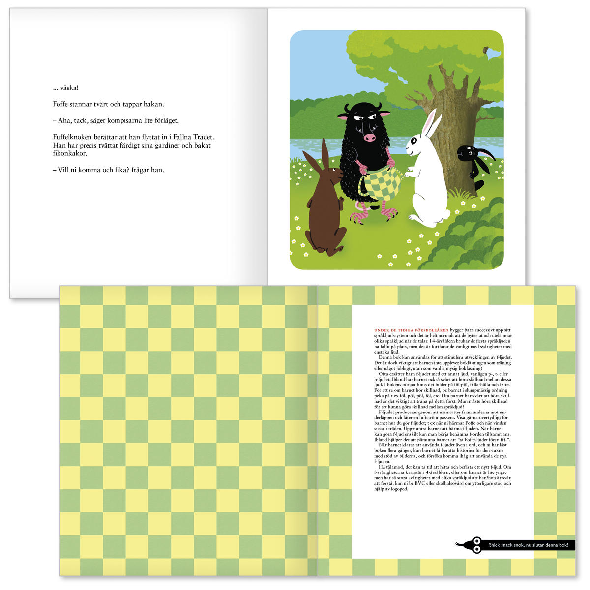 Faran vid fallna trädet kan användas för att stimulera utvecklingen av f-ljudet. En kort handledning finns i boken.