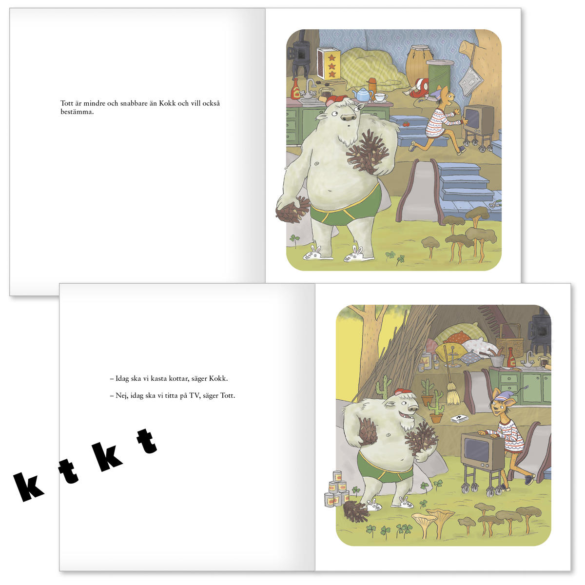 Följ med ut i skogen och träffa filurerna Kokk och Tott. Kokk är större och starkare än Tott, och vill gärna bestämma. Tott är mindre och snabbare än Kokk och vill också bestämma. Och när en vill titta på TV och en vill kasta kottar … vad gör man då?