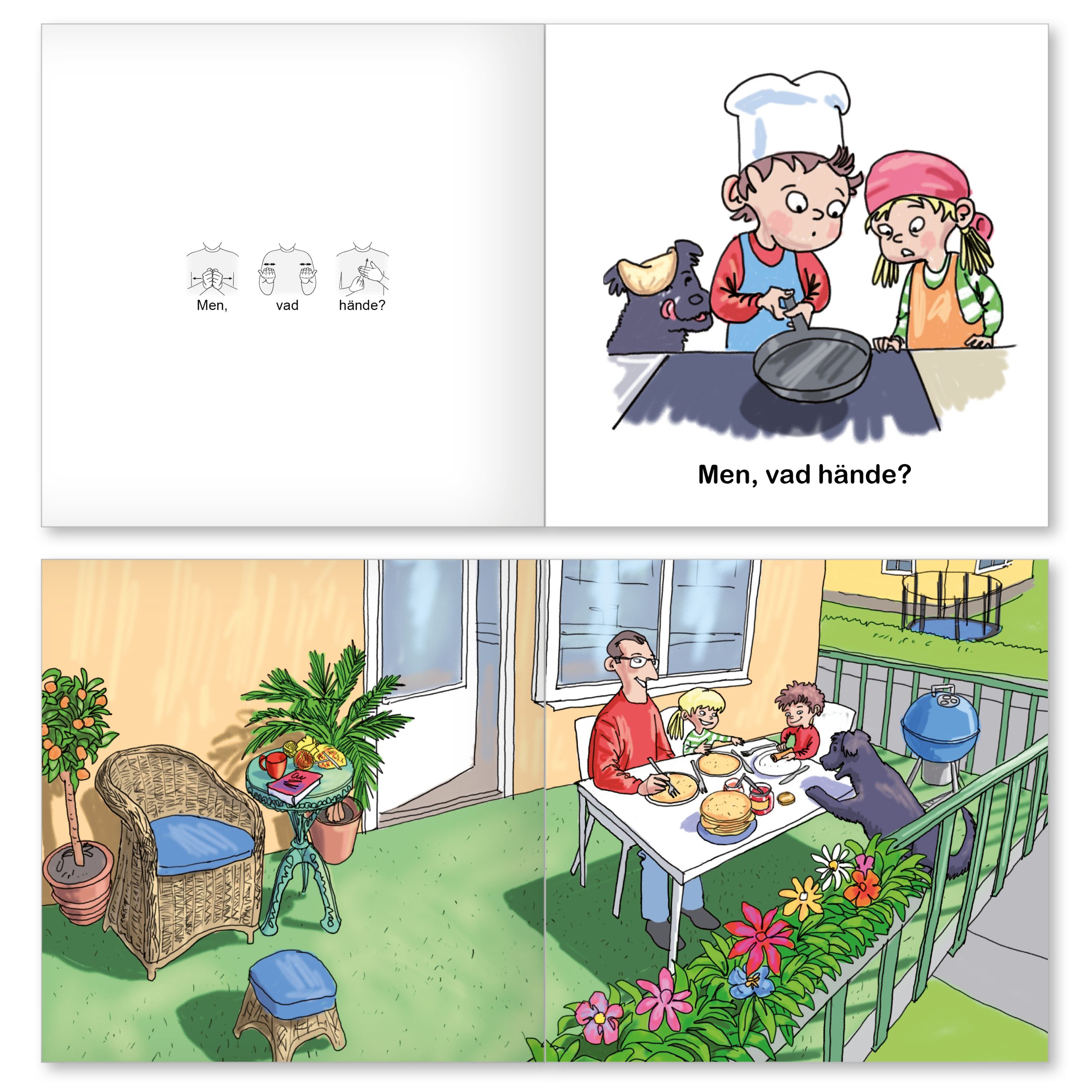Titta Mia! Jag kan vända pannkakor i luften. Men, vart tog Olles pannkaka vägen?