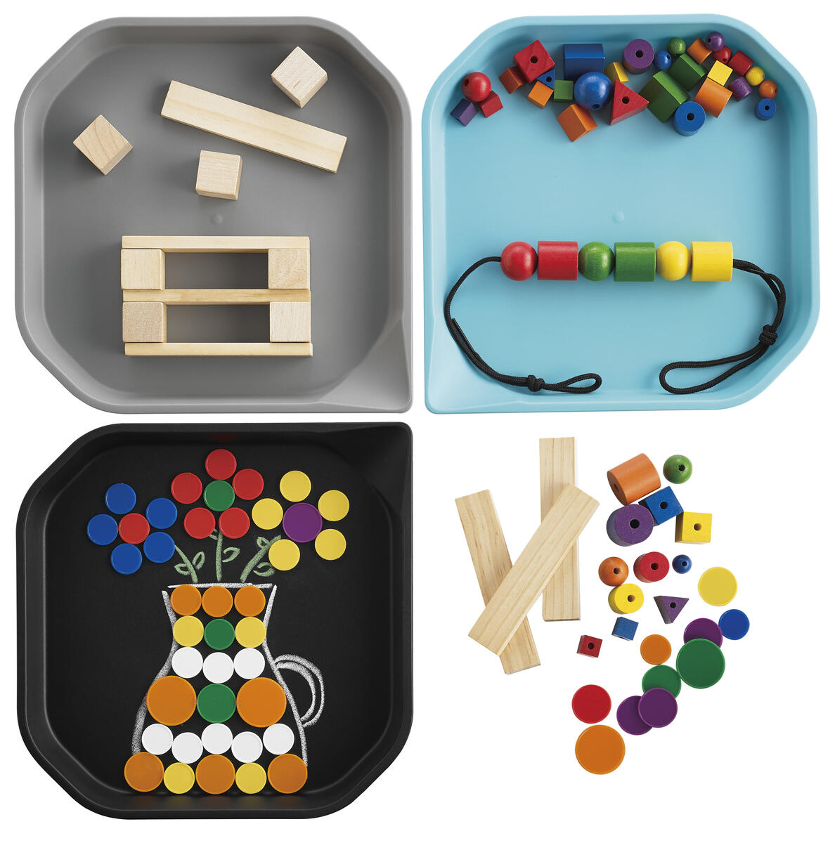 4 st/fp. Brickor för sortering, lösa smådelar eller sensoriska övningar. Passar i aktivitetsbrickan 13664. Av PP. Mått: 25x25x2,5 cm. Från 1 år.