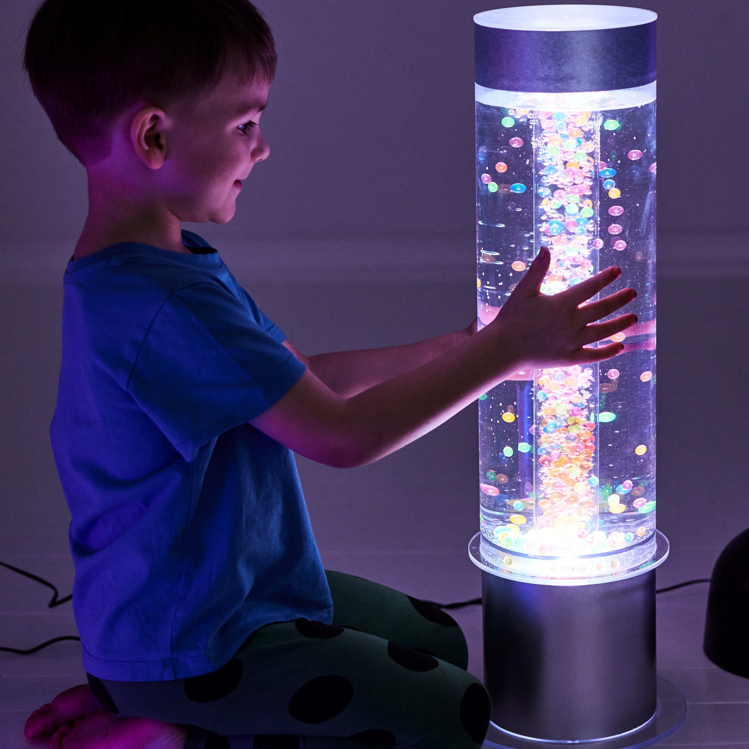 Ett lite vidare bubbelrör som ändrar färg och styr bubblorna genom en kolumn i bakkanten, för att sedan låta bollarna långsamt sjunka ner på framsidan. En verkligt avslappnande upplevelse. Fjärrkontroll medföljer. Mått: H60, ø 15 cm.