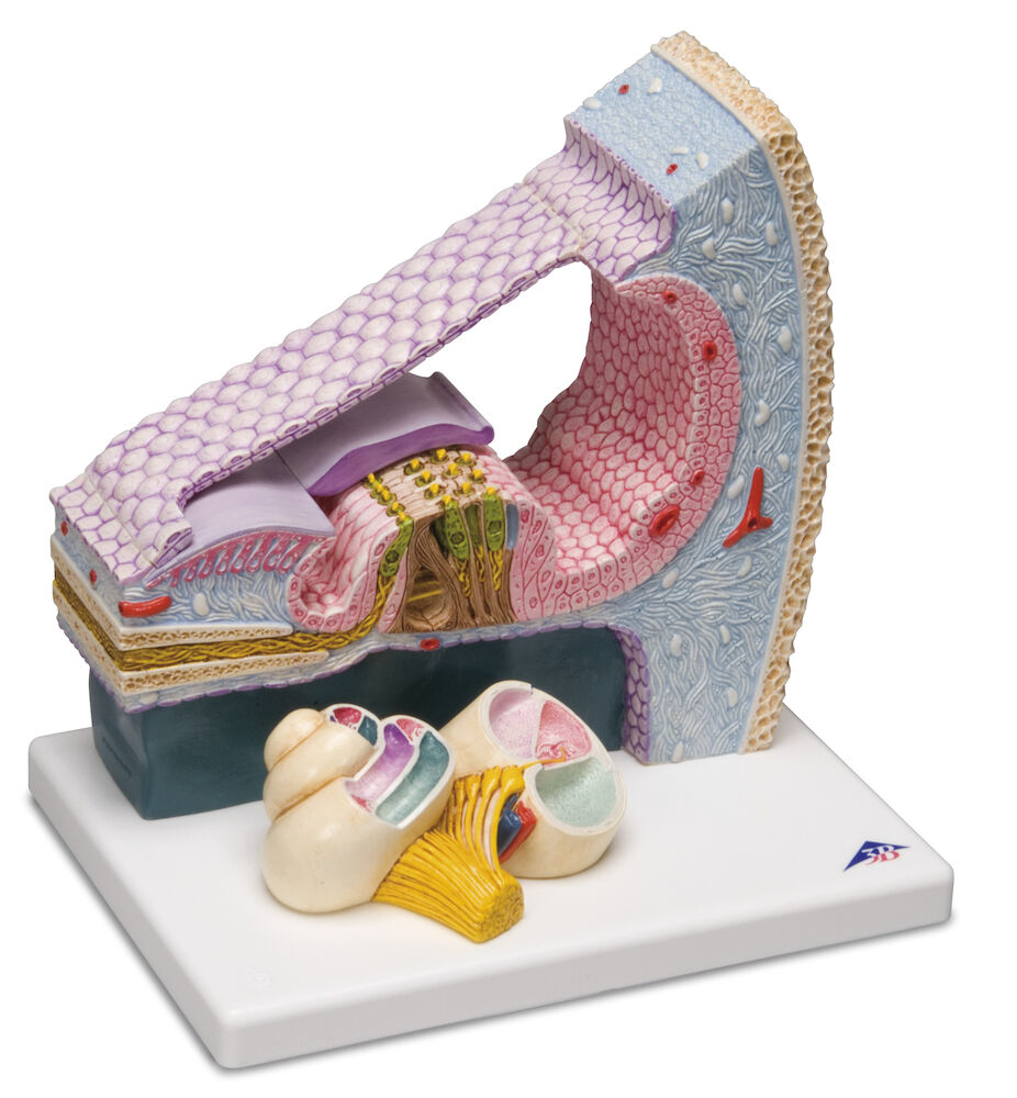 Cortis organ, platsen för hörselsinnet i innerörat hos människor. Detaljerad modell av de enskilda cellulära komponenterna och membranen. Översiktsmodellen i förgrunden visar den exakta placeringen av organet i snäckan.
