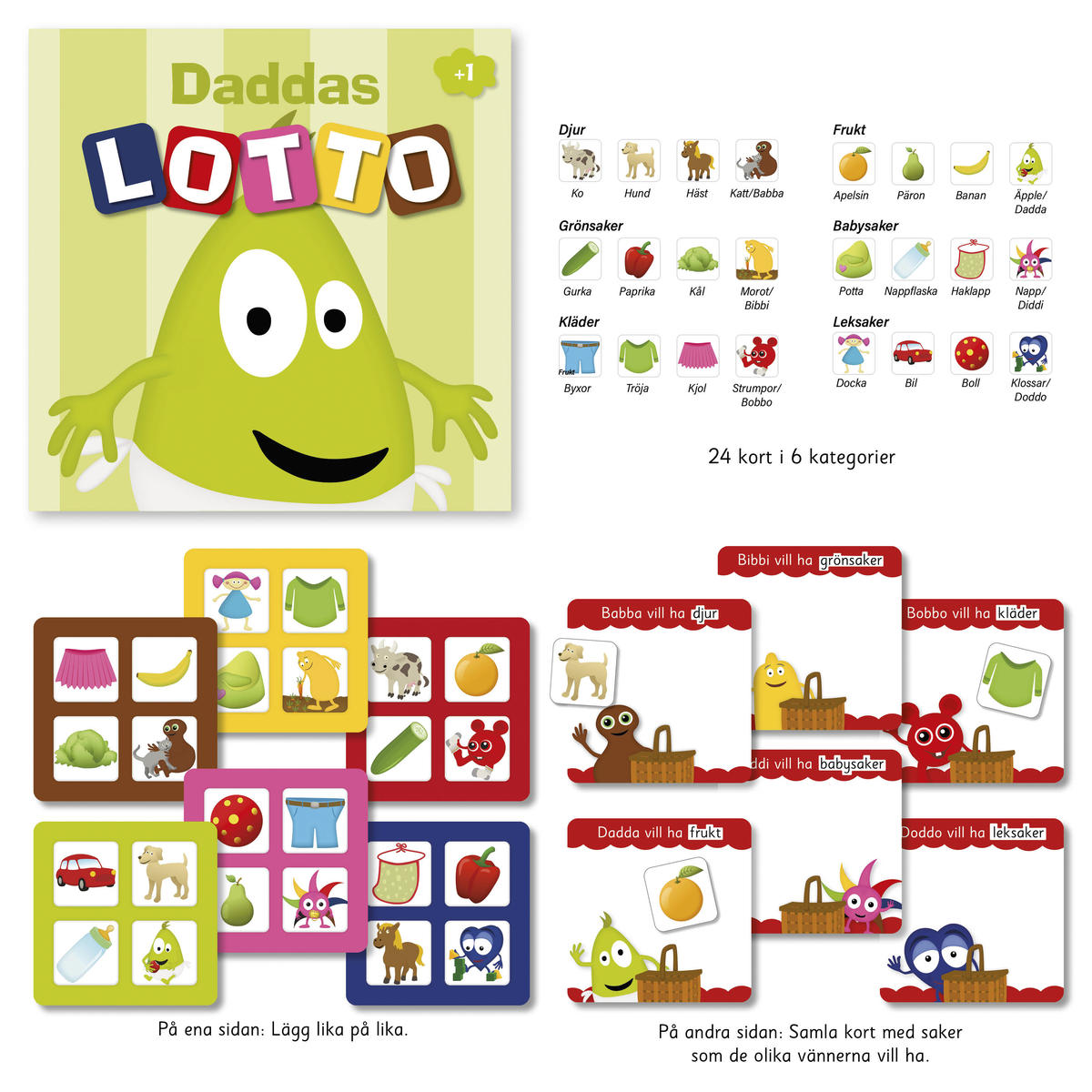 Babblarnas temalådor är inspirerande paket för språklek på ett specifikt tema förankrat i förskolans läroplan. I Daddas språklåda är temat närmiljö och natur. Fokus ligger på att barnen ska få lära sig ord, leka med ljud och sortera i kategorier. Lådan innehåller en stor kartongbok ”Dadda hälsar på”, en Språkleksbok med härliga uppslag för språkutvecklande aktiviteter, en sång med tillhörande sånglek, ett lottospel, Dadda som handdocka och Babblarna fingerdockor med bilen Tut. Materialet levereras med en lättläst och tydlig handledning.