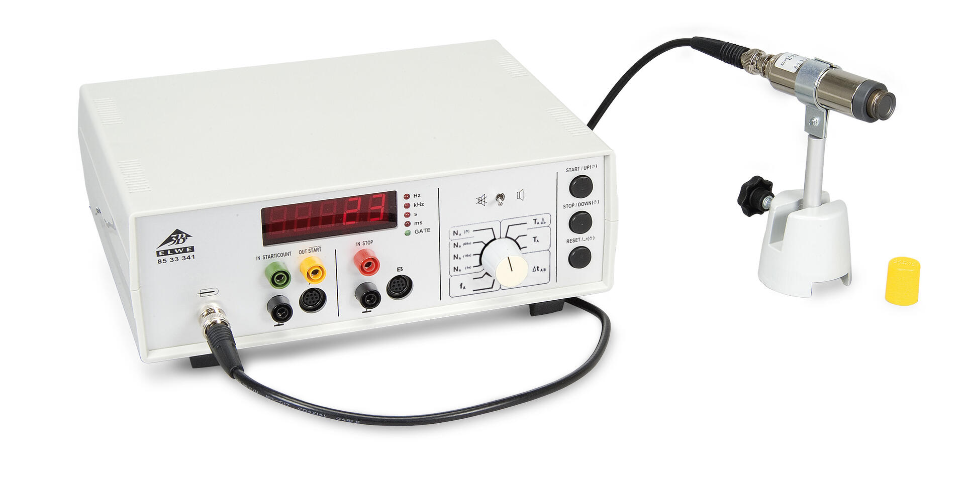 Digital räknare/timer för mätning av rörelsetid, övergångstider, perioder, pendelperioder, frekvenser, samt för att räkna händelser eller geigerrörspulser. Inkluderar en högtalare som kan slås på och av och strömförsörjning för direkt anslutning till ljusbarriärer (U11365) eller en Geiger-Müller-räknare (U8533430). För händelseräkning kan en fast inventeringsperiod programmeras i ett intervall från 0,1 ms till 99999 s. Mothändelser (t.ex. start eller stopp) kan antingen utlöses av en signal till ingångarna eller manuellt via strömbrytare.Enheten har en plug-in strömförsörjning.
