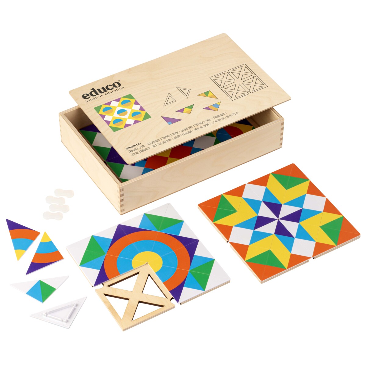 4 ramar i trä, 64 triangelformer i plast med mönster, trälåda för förvaring. Detta material låter barn lära sig att kombinera former och färger för att skapa sina egna konstverk. Stimulerar känslan för former, färger, mönster och symmetri. Det tränar också barnets finmotorik. Mått trälådan: 33,5×22,5×7 cm. Från 4 år.