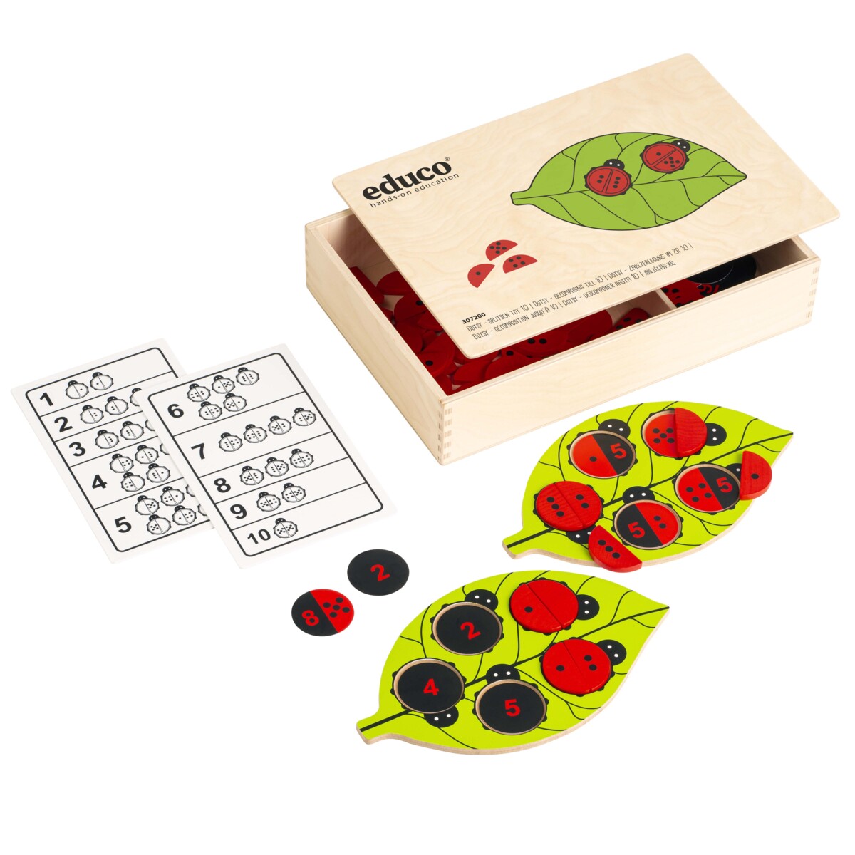 2 lövformer i trä, 48 cirkulära uppgiftskort med prickar och/eller siffror, 62 "vingar", 2 facitkort. Skapa nyckelpigor genom att kombinera 2 vingar med prickar. Upptäck olika sätt att kombinera ihop tal från 1 till 10. Med materialet tränas addition av tal upp till 10, tiokompisar och även förståelse för uppdelning av tal. Självrättande genom facitkortet där alla kombinationer upp till 10 finns angivna. Manual på engelska ingår. Mått trälåda: 33×32,5×7 cm. Från 4 år.