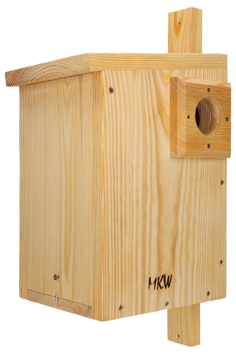 Ett hus för ekorrar som skyddar mot regn och vind och där de kan vila och sova. Tillverkad av slitstarkt, massivt FSC-certifierat trä som är behandlat med 2 lager luktfri linolja. Dräneringshål i botten hjälper till att släppa ut vatten ur huset. Frontpanelen är öppningsbar. Ingångshål på 5 cm och en extra platta som skyddar ingångshålet medföljer. Levereras färdigmonterat med rostfria skruvar.